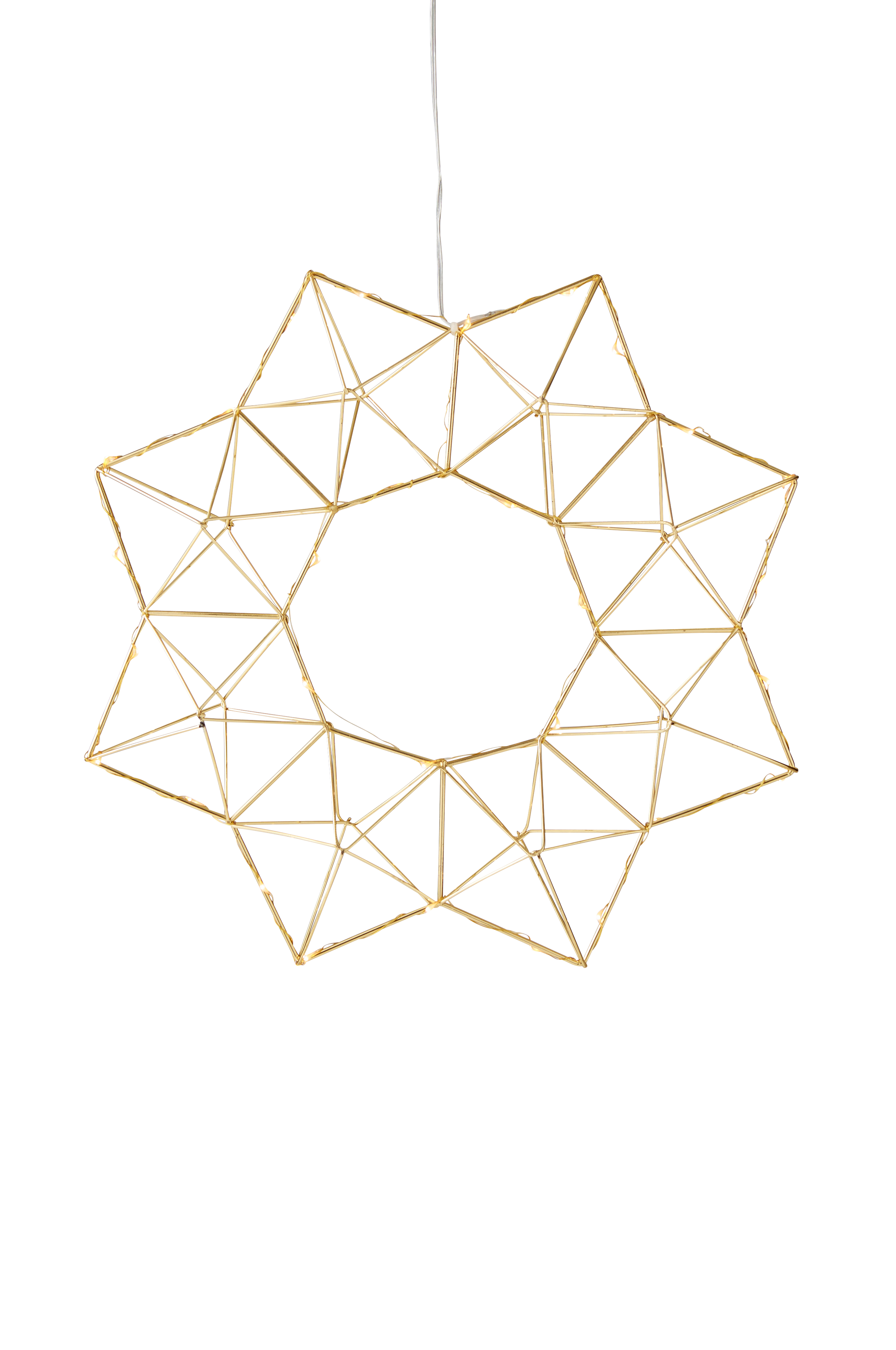 Hengende stjerne av metall. Ø 40 cm. Dybde 6 cm. Ledningslengde 3,5 m. 30 LED-pærer (ikke utbyttbare) inngår.