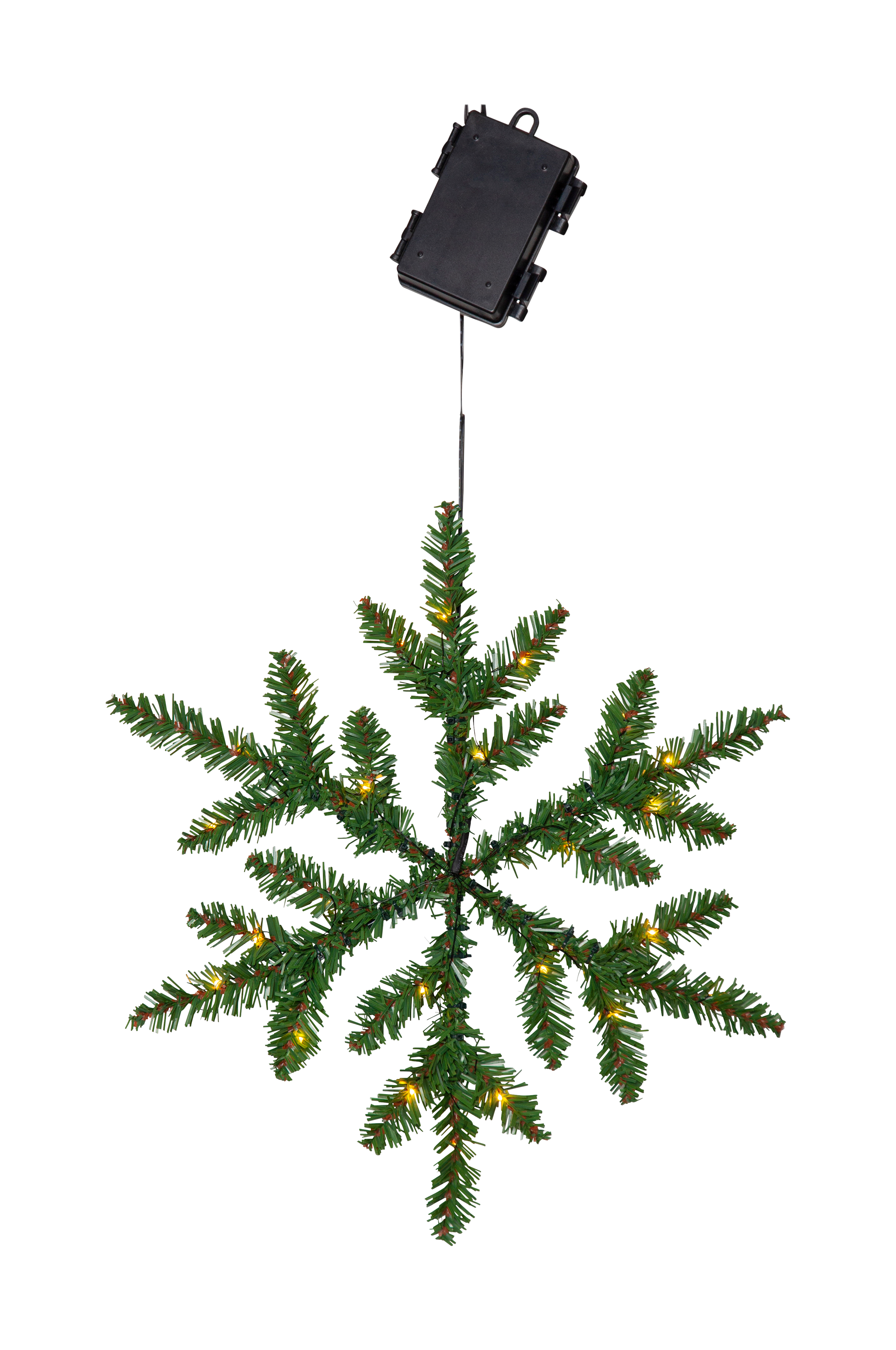 Snowflake dekor blir en vakker dekor på en ytterdør utendørs eller i et vindu innendørs. Barnålene er laget av Rohs- og REACH-godkjent PVC som sitter montert på en metallstamme. Med små varmhvite lyspunkter lyser den opp fint i mørket. Kan fint brukes både innendørs og utendørs. Drives av 3 stk. AA-batterier, og har også tidsurfunksjon. Når bryteren er på tidsur, lyser snøkrystallen i ca. 30 dager. Batterier er ikke inkludert.