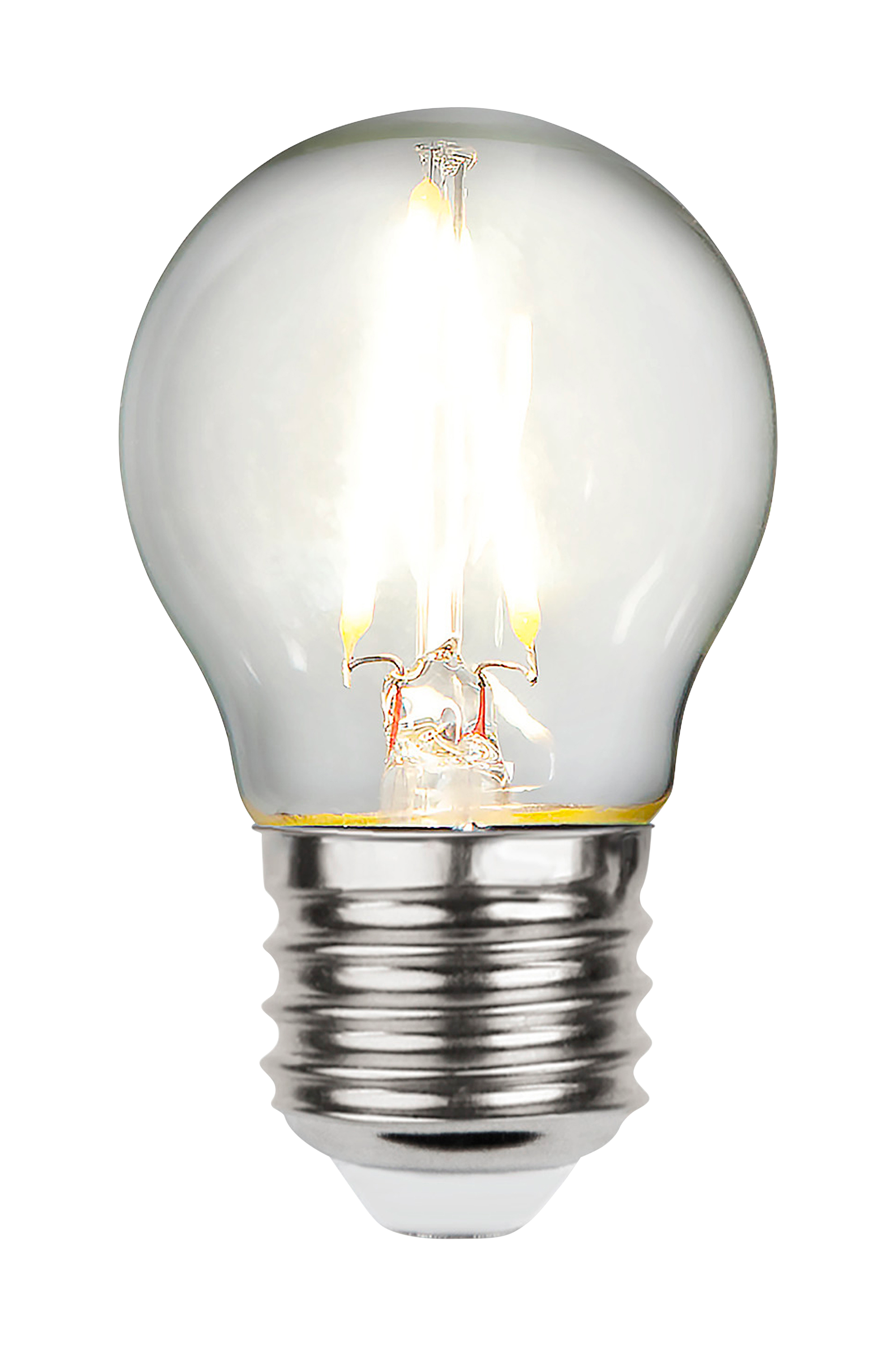 Klar LED-filament pære med E27 sokkel. Fargetemperaturen er 2700 kelvin. Lyseffekten er 250 lumen (25 W). Watt = energiforbruk. Lumen = hvor mye lys som avgis. Størrelse: 4,5x7,6x4,5 cm.