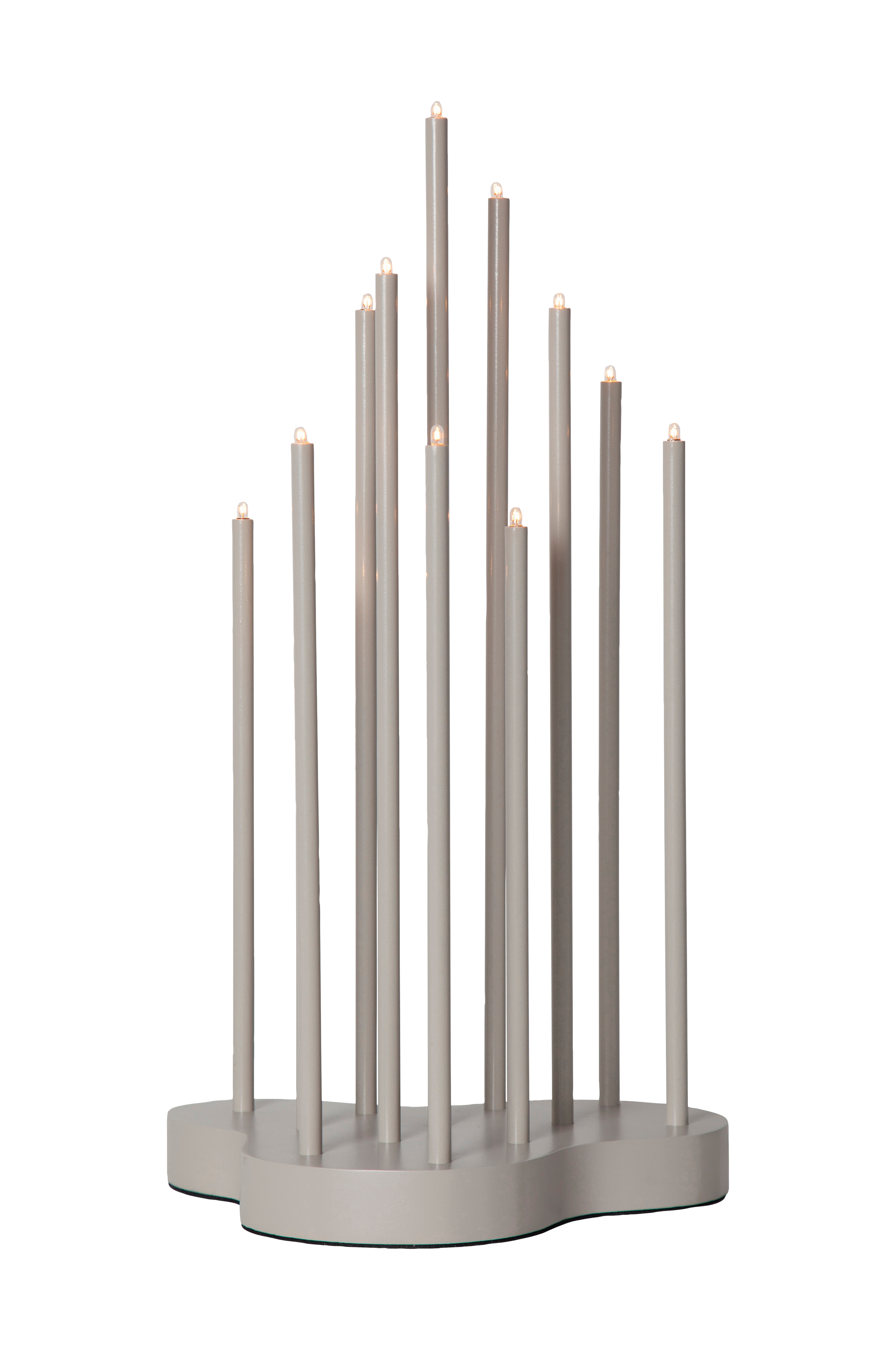 Stilren lysestake med kraftig trebase, lysholdere av tynne metallrør. 12 stk lyskilder, e5 lyspærer. Hele lysestaken er i hvit farge. Tekstilkledd hvit/grå ledning. Gir et herlig stemningsfullt lys hele året.