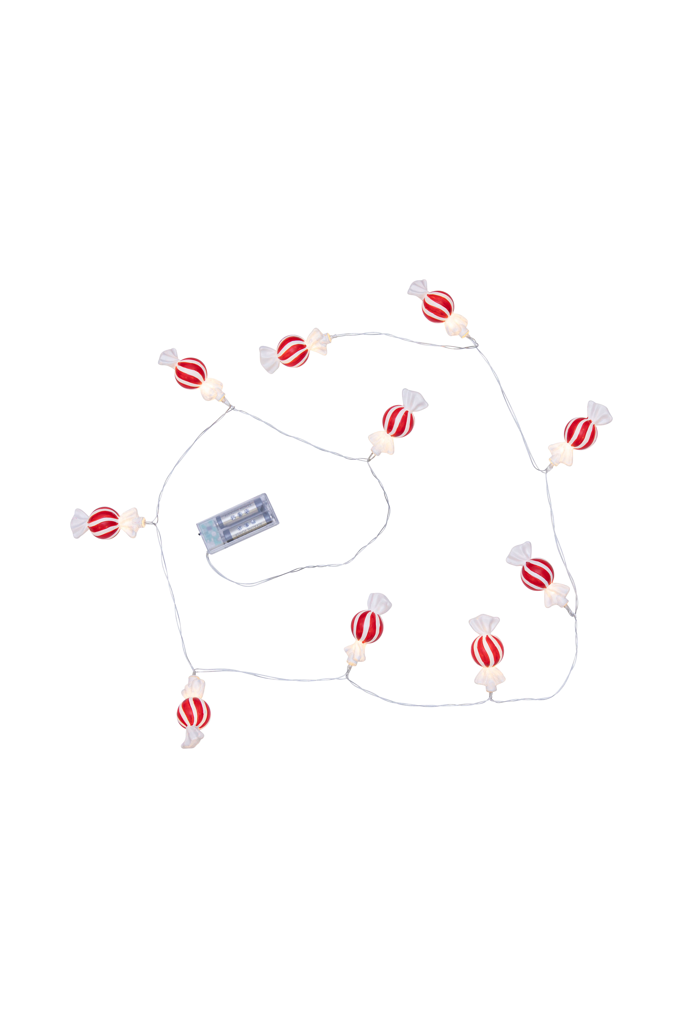 Stilig lyskjede med klassiske røde og hvite dekorasjoner i form av godteri. 10 varmhvite LED, timerfunksjon i batteriboks. 6 t på 18 t av, gjenta. Pynt juletreet eller bordet med denne vakre lyskjeden. For innendørs bruk.
