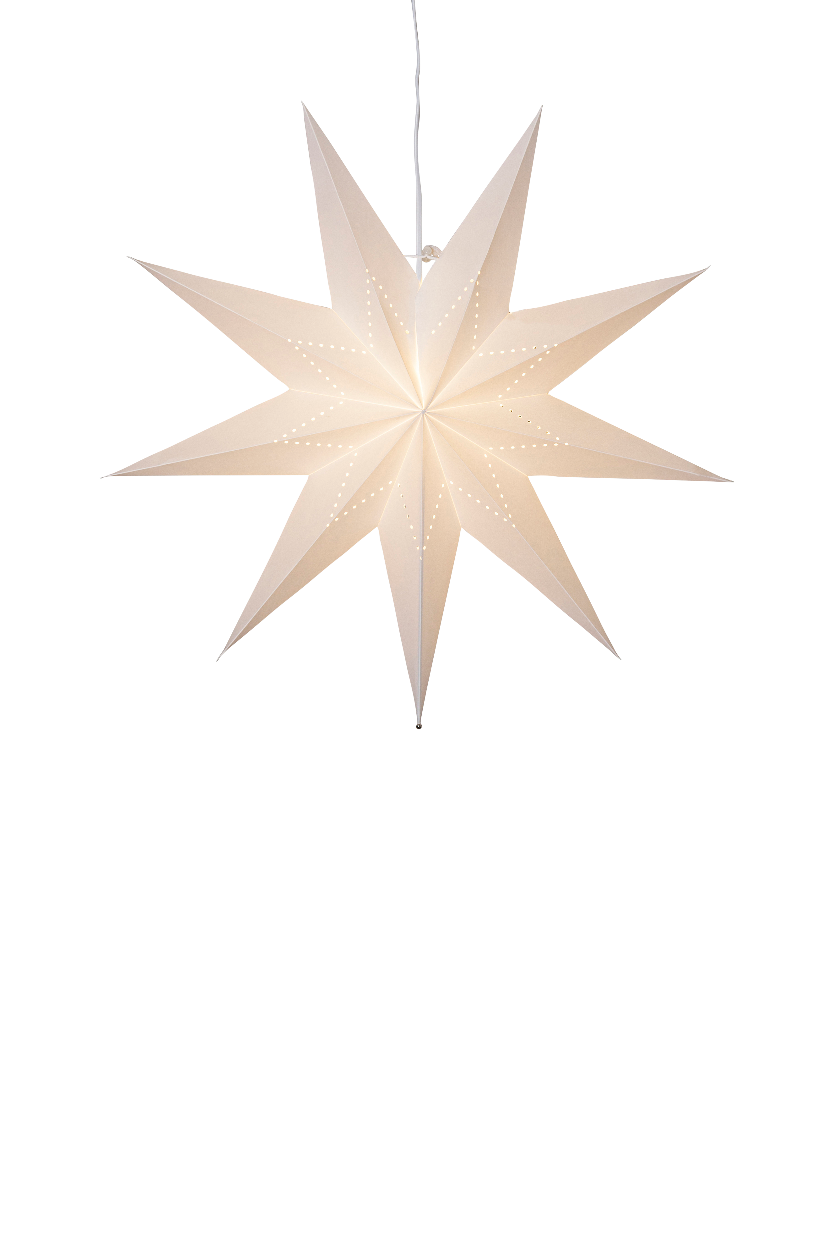 Hvit papirstjerne med hullmønster i form av en stjerne. Dekorer med til jul og advent. Heng en eller flere stjerner sammen i et vindu eller mot en vegg. Stjernen har plass til en lyskilde, og det følger med oppheng for E14 lampe.