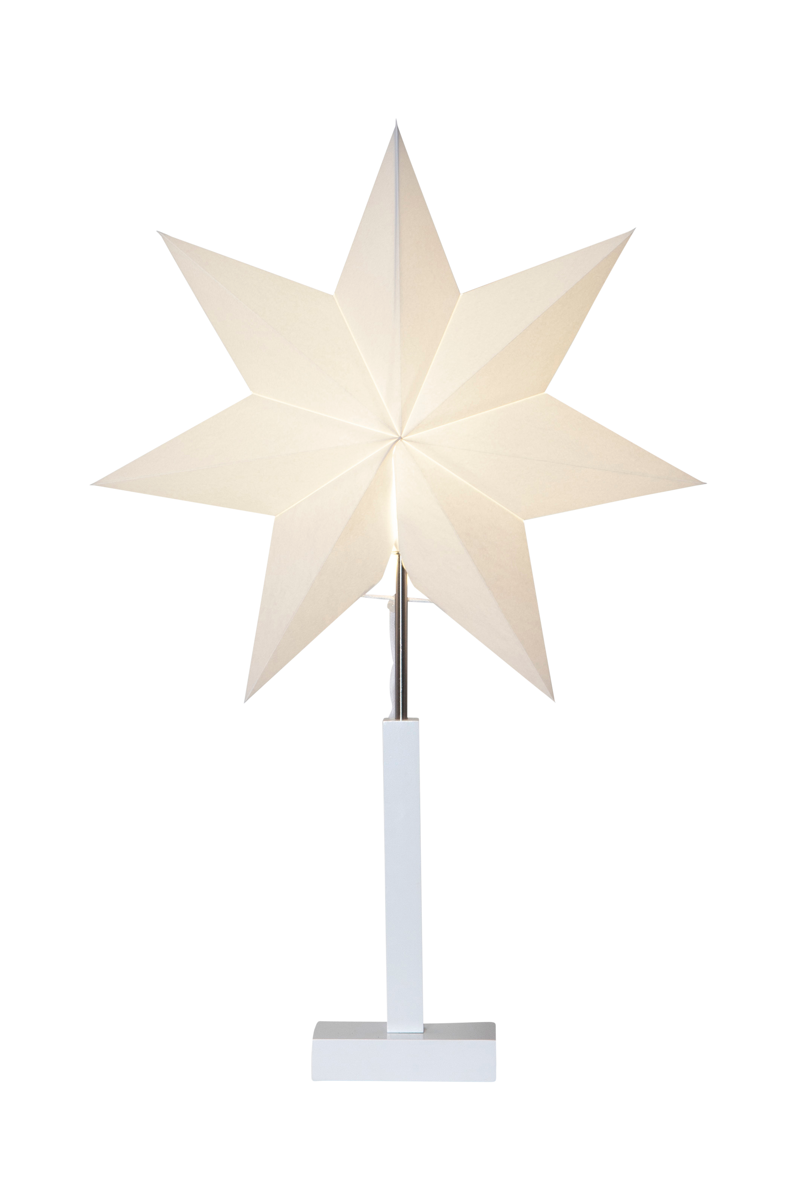 Stjerne på fot. Gir et stilrent og moderne inntrykk, plasseres i vinduet for å skape den perfekte stemningen. E14-sokkel, lyspærer er ikke inkludert. Hvit ledning, 180 cm. Høyde 68 cm, bredde/lengde 43 cm og dybde 15 cm. Maks effekt 25W.
