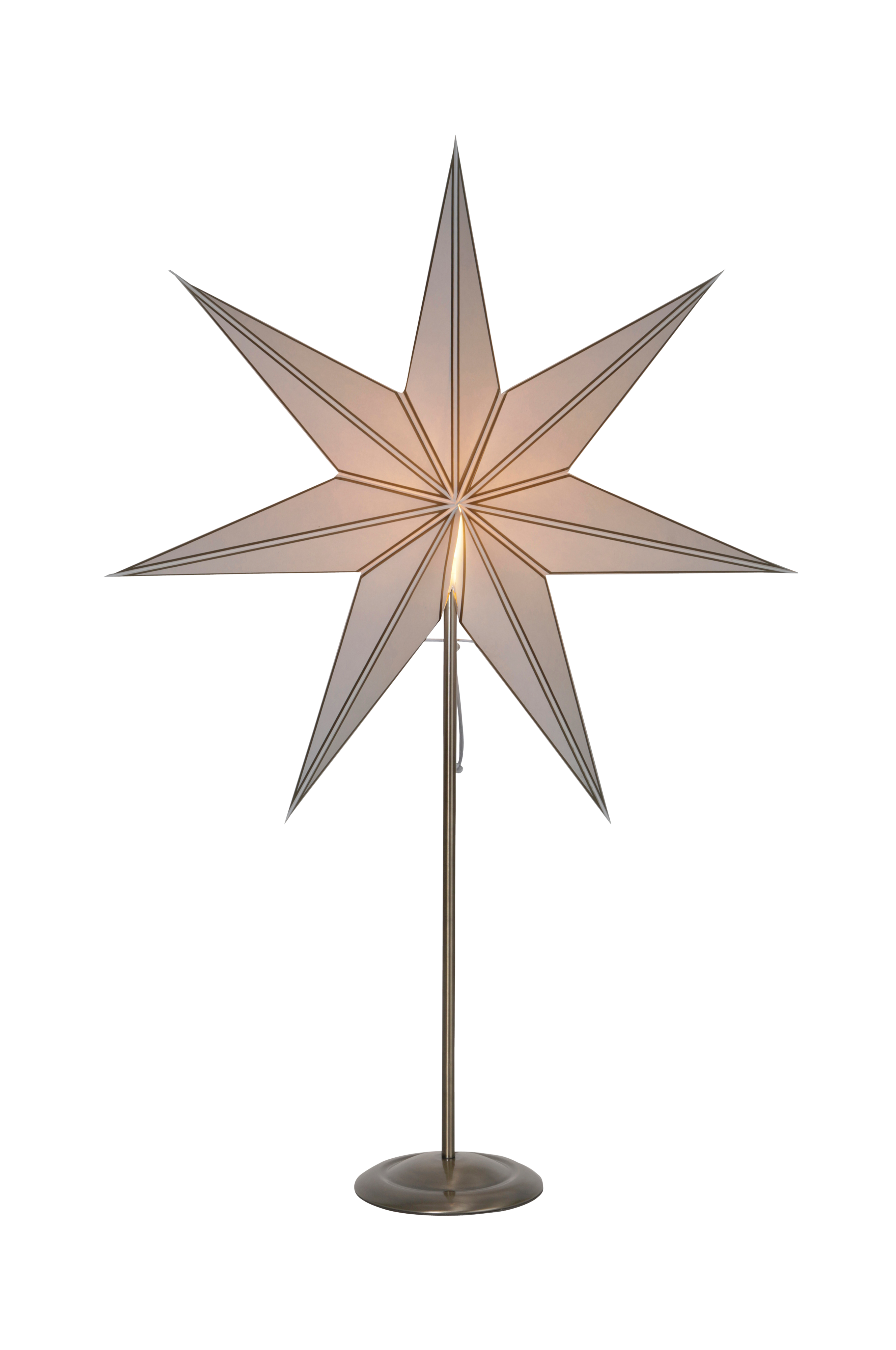 Stjerne med messingfot for innendørsbruk. Gjør seg veldig fint i et vindu og på et bord. Sprer koselig stemning i hjemmet. Bredde 60, høyde 88, dybde 16 cm. 1,8 m ledning med strømbryter.