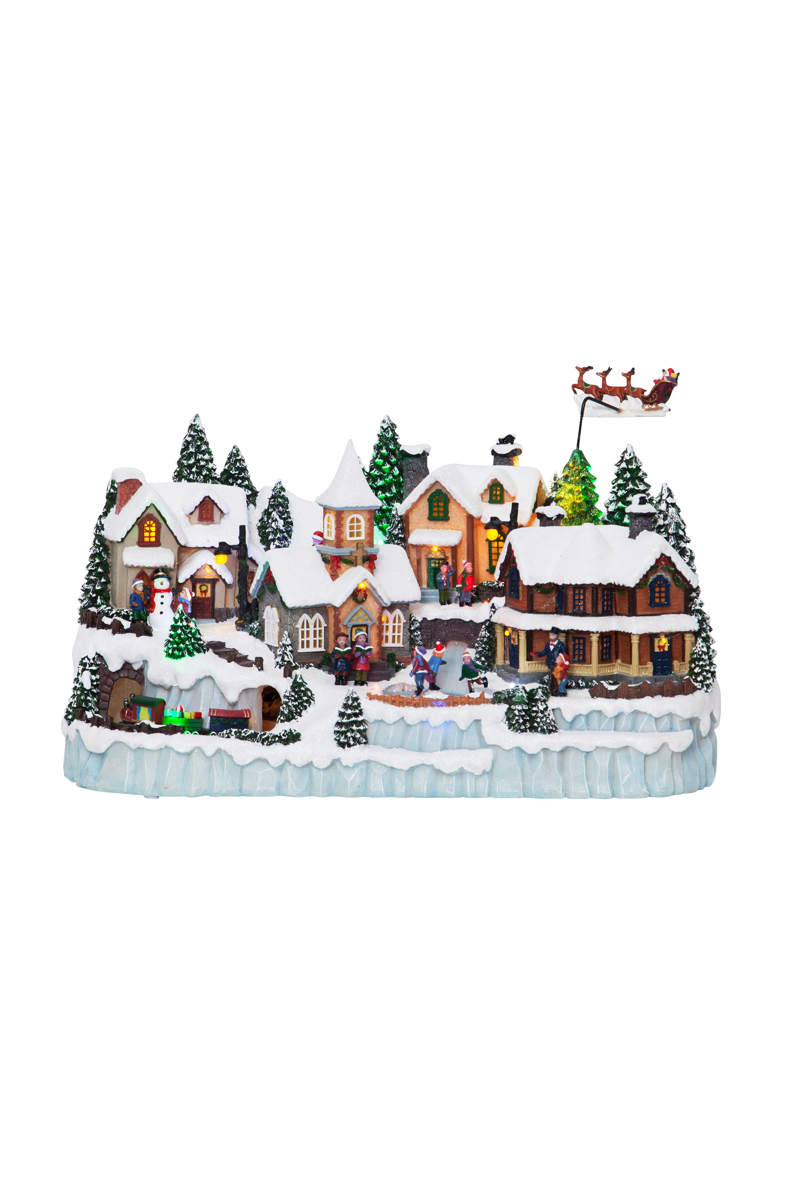 Stor juleby med 31 lyspunkter, åtte julesanger og tre roterende deler. Toget, barna på skøyter og reinen med slede og nisse roterer. For innendørsbruk. Ledningslengde 1,8 m. Lyspærer medfølger. Strøm- og batteridrevet. Drives av 3 batterier AA (ikke inkludert).
