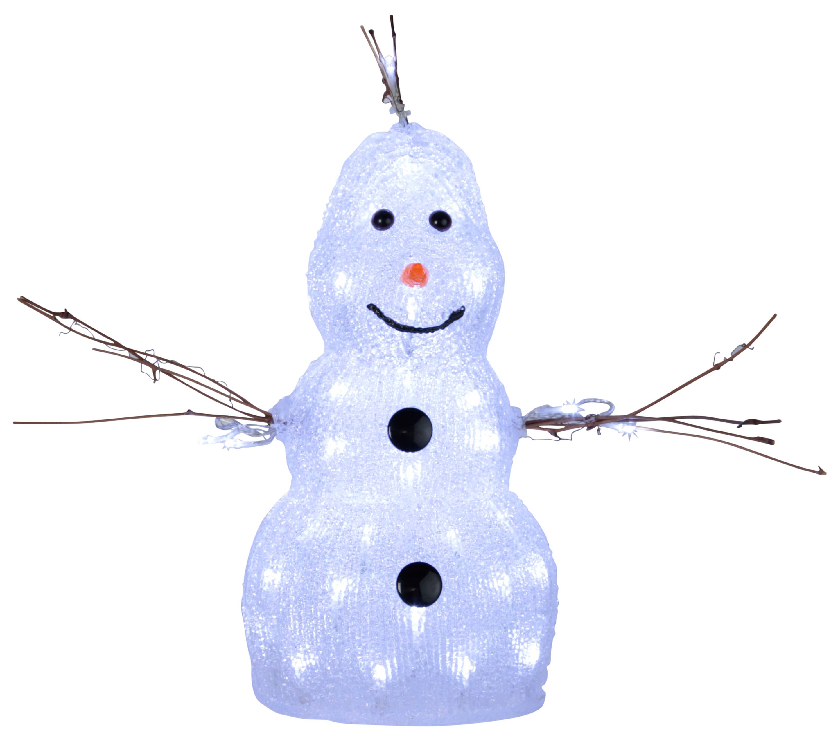 Snømann i akryl med 50 LED-dioder. IP44. Høyde 38 cm. Dybde 19 cm. Bredde 21 cm. Tilkoblingskabel 3 m.