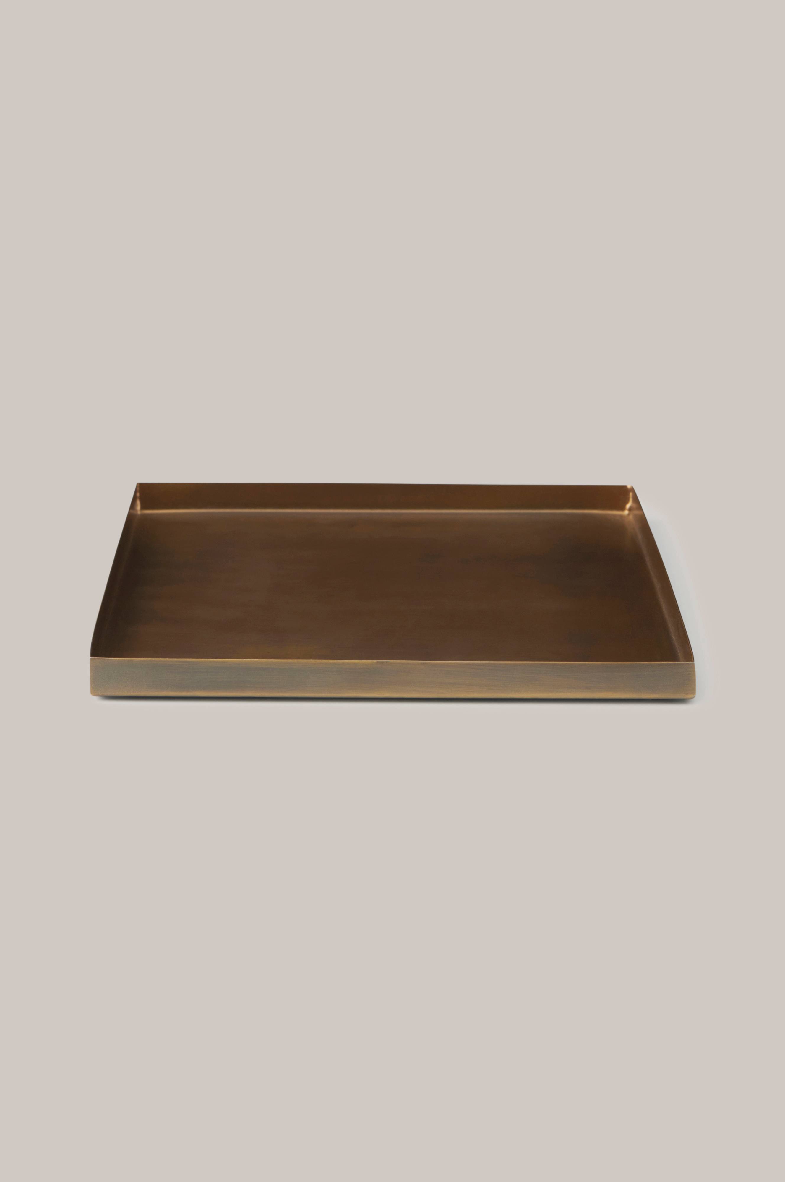 Fat i rustfritt stål med antikkmessing. Kan også brukes utendørs. Egnet til å f.eks. plasseres under en potte.