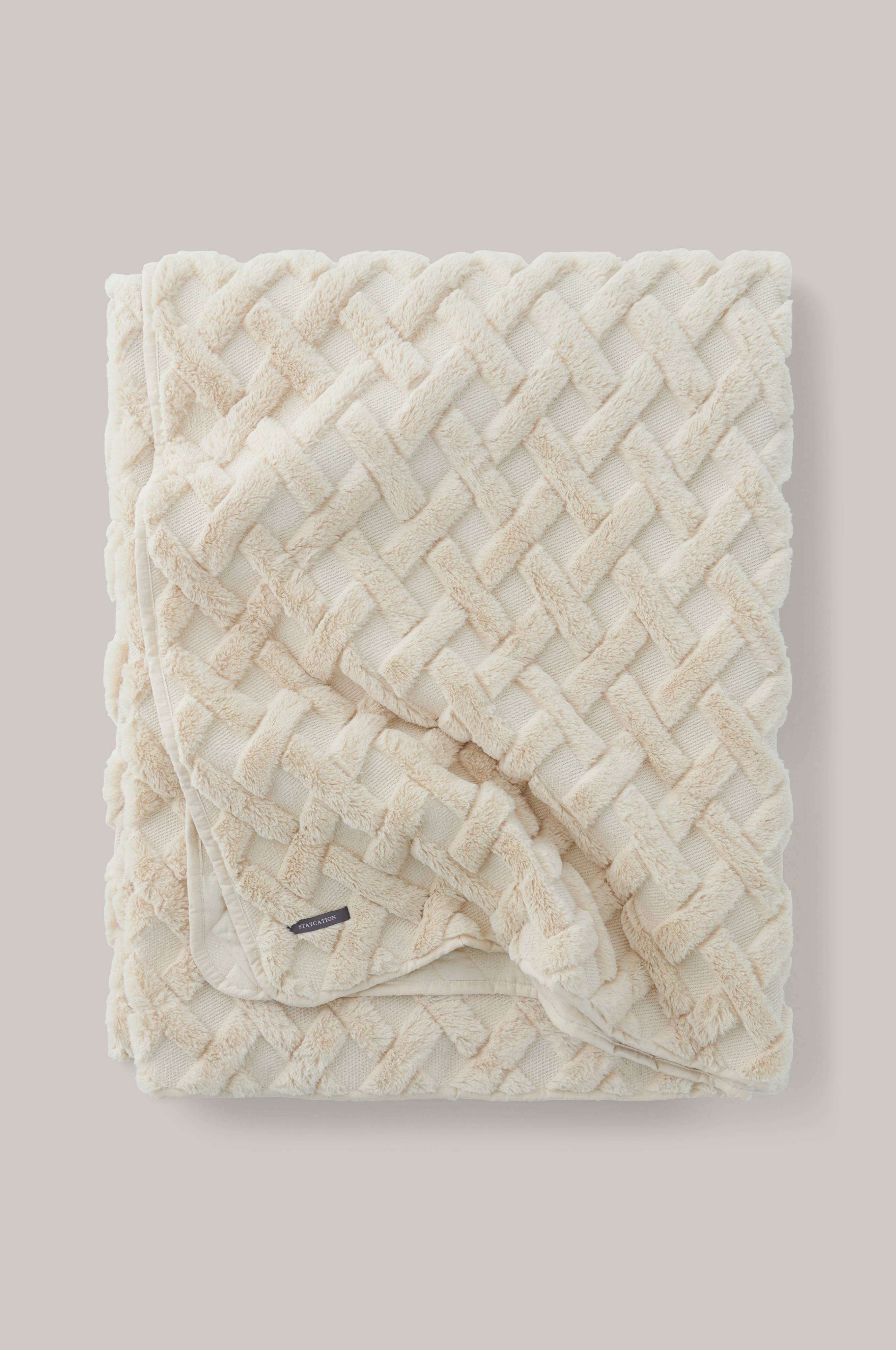 Sengeteppe med forside i brodert dekorquilting med myk fuskepels. Quiltet bakside i bomull.