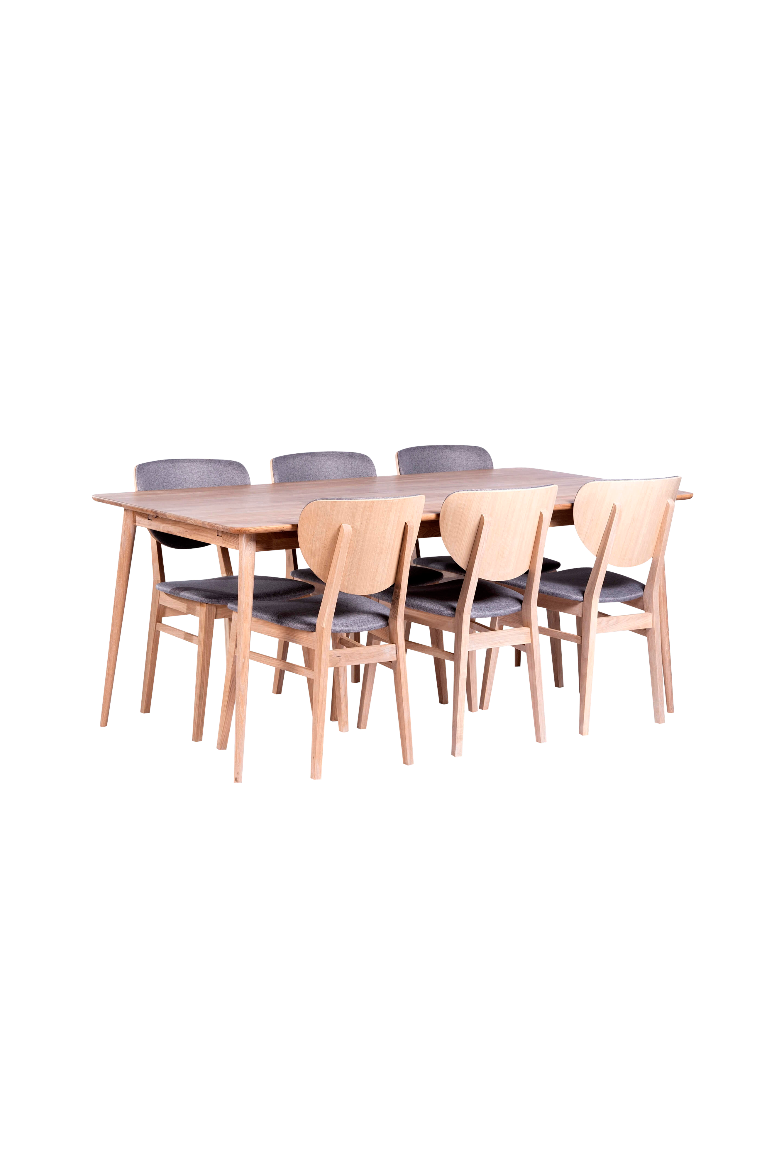 Elegant spisegruppe med bord i massiv hvit eik og 6 stoler i massiv eik. Bordet kan kompletteres med innstikklaff på begge sider hvis man vil. Praktisk når dere blir mange til bords.