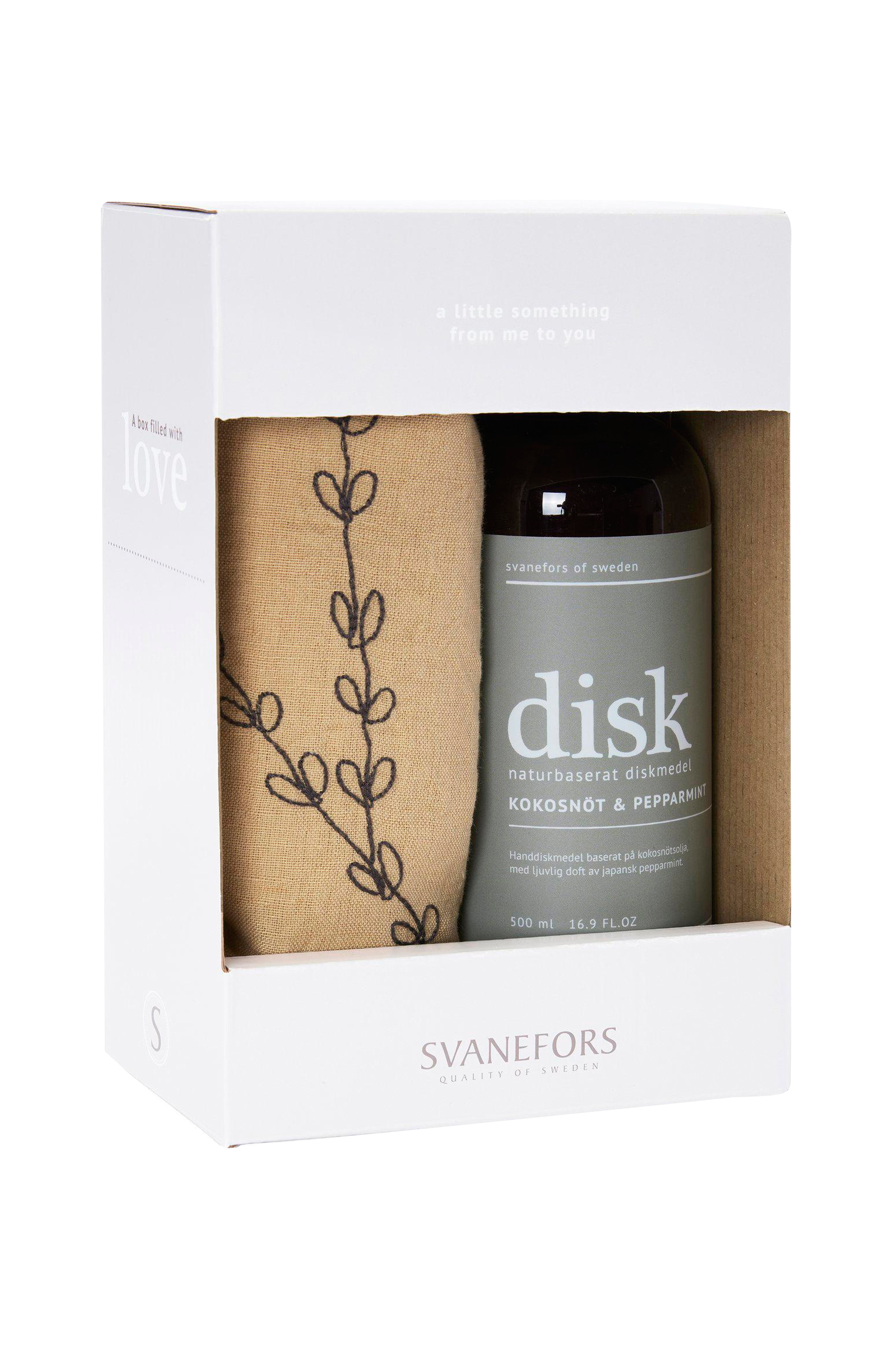 Oppvaskmiddel og kjøkkenhåndkle i fin gaveeske. Kjøkkenhåndkle, 50x70 cm i 50% lin og 50% bomull, med brodert mønster i nedre hjørne. Oppvaskmiddel basert på kokosnøttolje som skånsomt rengjør uten å gjøre hendene tørre og røde. Inneholder også japansk peppermynte som er og har en deilig fresh duft. Flasken inneholder 500 ml.