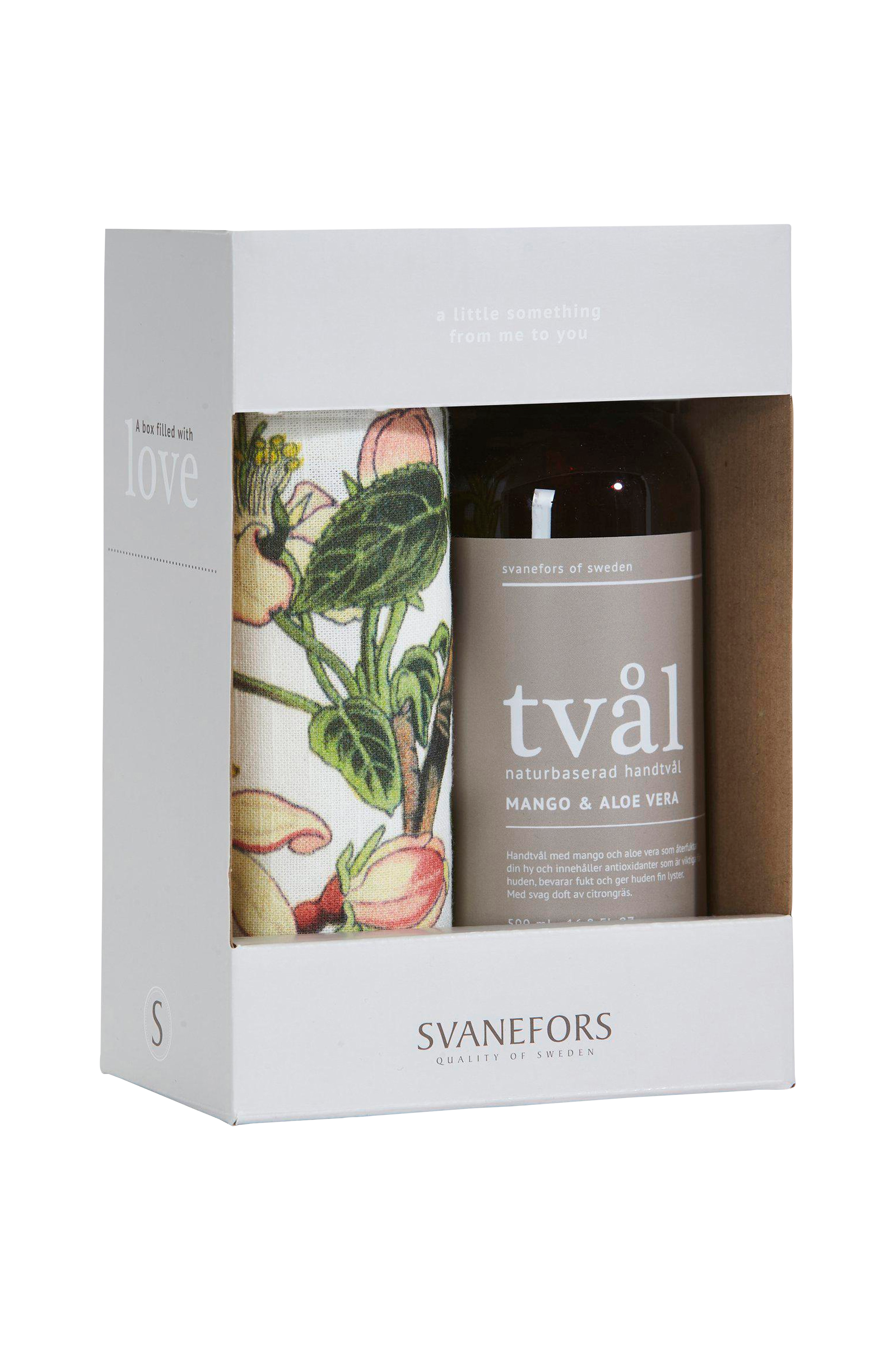 Håndsåpe og kjøkkenhåndkle i fin gaveeske. Kjøkkenhåndkle i 100% bomull, 50x70 cm. Håndsåpe med mango og aloe vera som fukter huden. Inneholder antioksidanter som er viktige for huden, bevarer fukt og gir huden en fin glød. Flasken inneholder 500 ml.