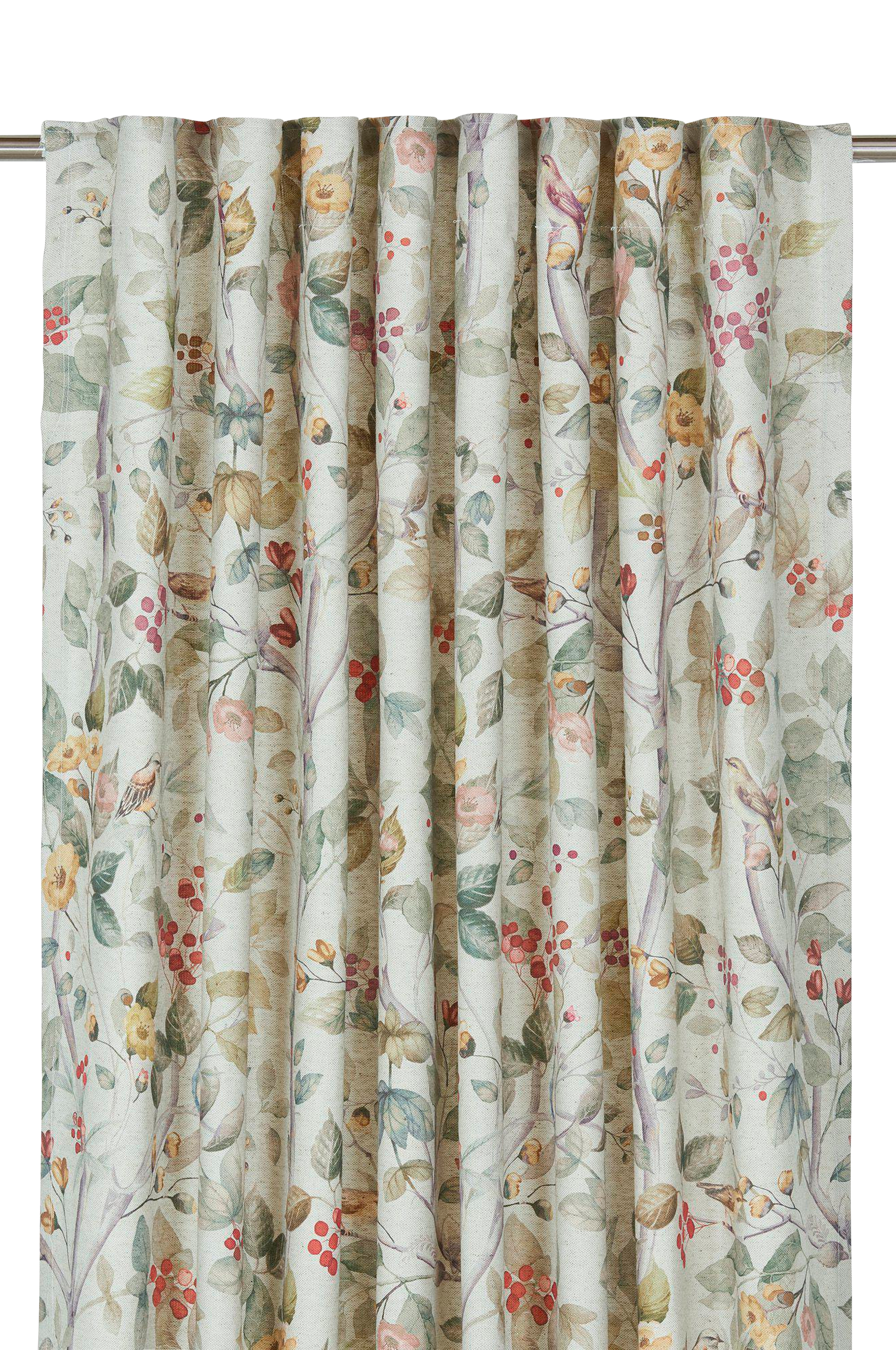 Gardin med trykt mønster på stoff med innslag av lin. 2-pk gardinlengder med multibånd i overkant, faldede langsider og overlocksøm i nederkant. Multibånd er en fleksibel løsning som gjør det mulig å henge opp gardinen med fingerkroker, hekter eller direkte på stang, avhengig av hvilken type folder og hvilket fall man vil ha på gardinen. Bruk hurtigfaldebånd for å få ønsket lengde på gardinen. Kan krympe maks 5% i bredden og 1% på lengden. 50% polyester, 40% bomull, 10% lin. 2x135x260 cm.