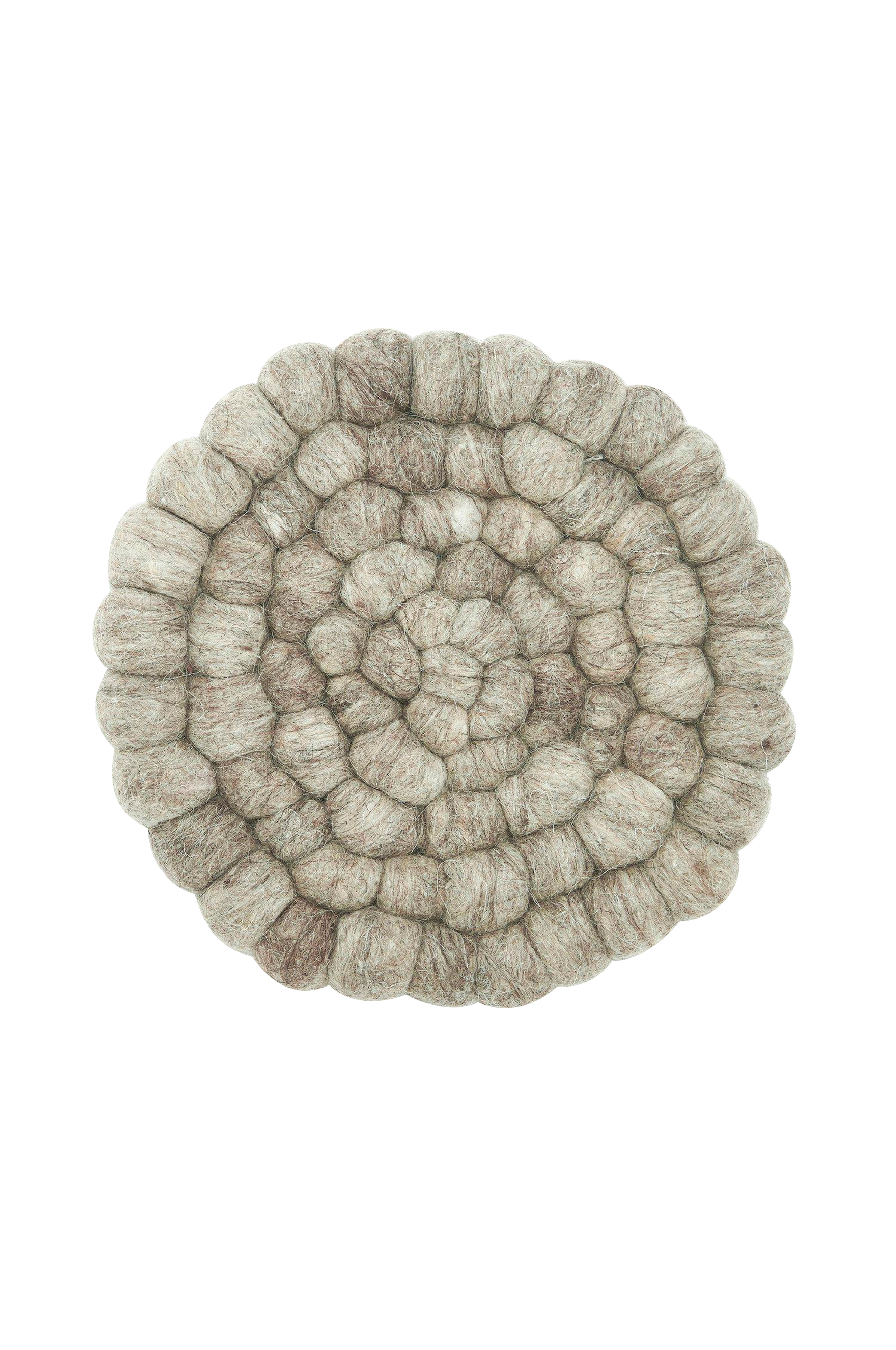 Gryteunderlag i ull med tovede baller gir en koselig og dekorativ følelse på det dekkede bordet. Mål: 20 cm i diameter. 100% ull.
