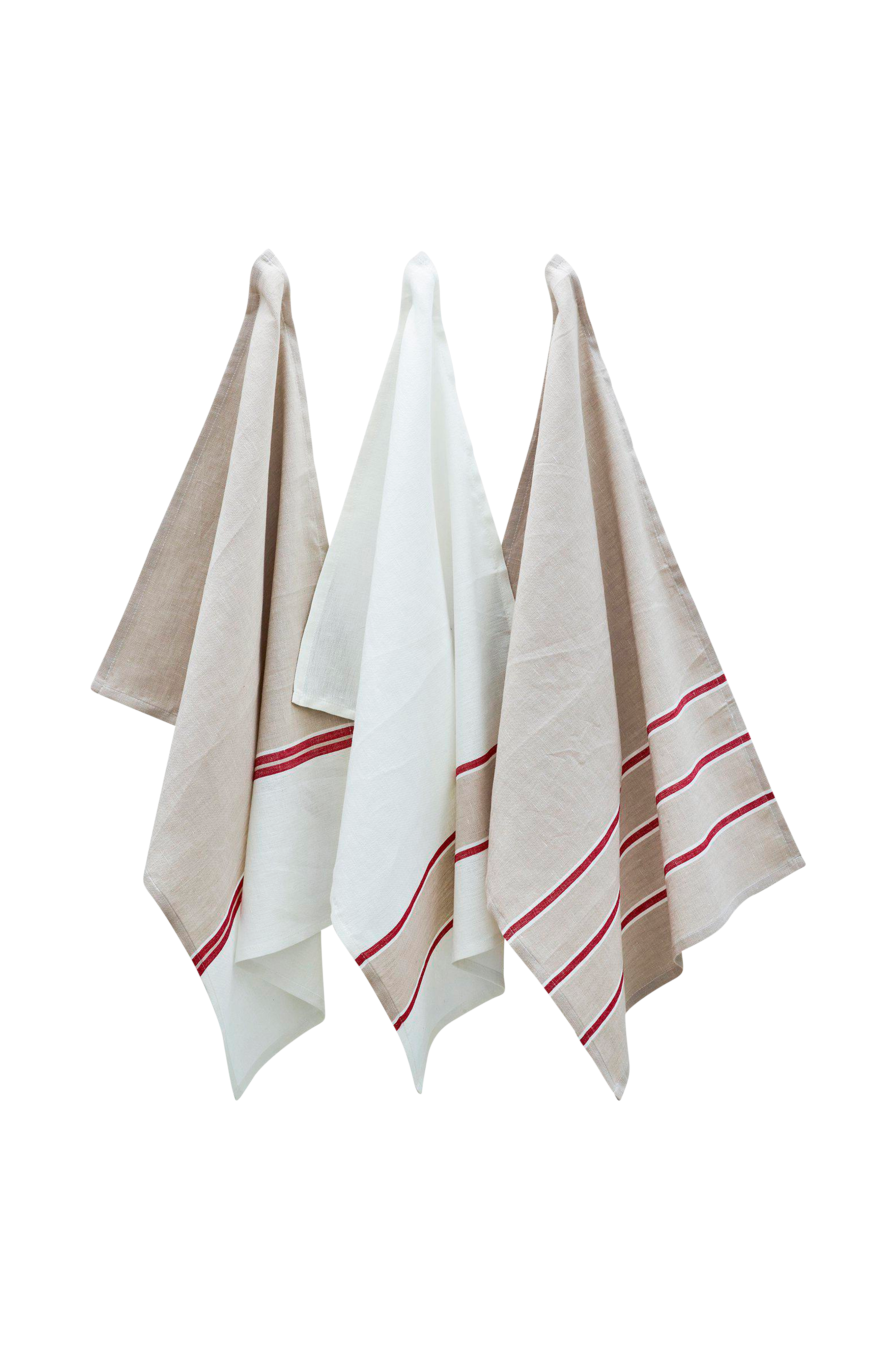 3-pk kjøkkenhåndklær i halvlin med matchende striper. Kjøkkenhåndkleet har en lett vasket effekt. Lin absorberer godt og loer ikke, derfor er det en utmerket kvalitet for kjøkkenhåndklær. Mål 50x70 cm. 50% lin, 50% bomull.