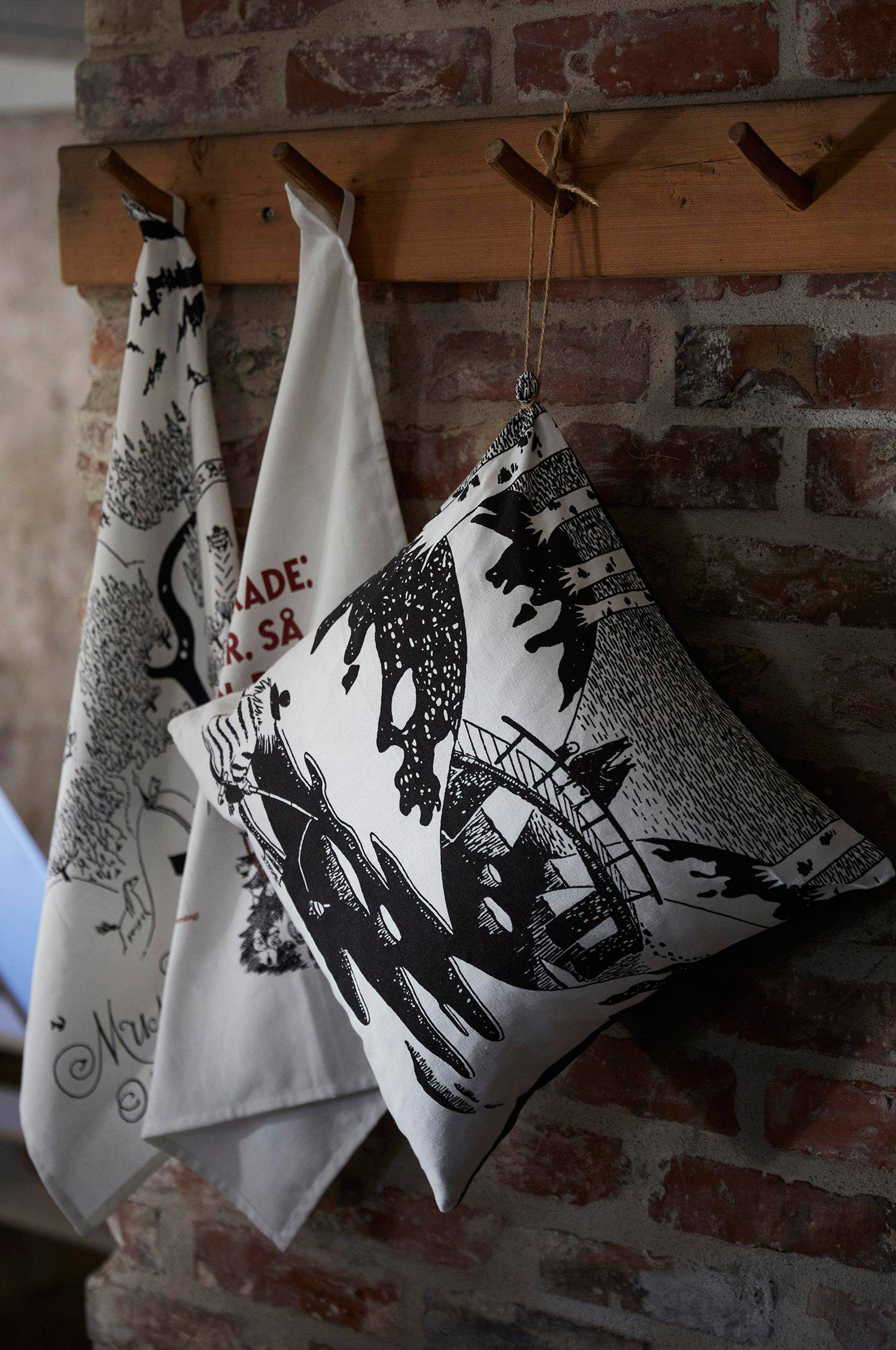 «Det er vinter i Mummidalen, men Mummitrollet vil ikke gå i hi, han vil undersøke vinteren. Snart oppdager han at det går merkelige skapninger rundt i den midtvintermørke snøen og ser ut til å vente på en merkelig og etterlengtet gjest.» Kjøkkenhåndkle med trykk fra Tove Janssons bok Trollvinter. Håndkleet har en hempe i det ene hjørnet for oppheng. 100% bomull.