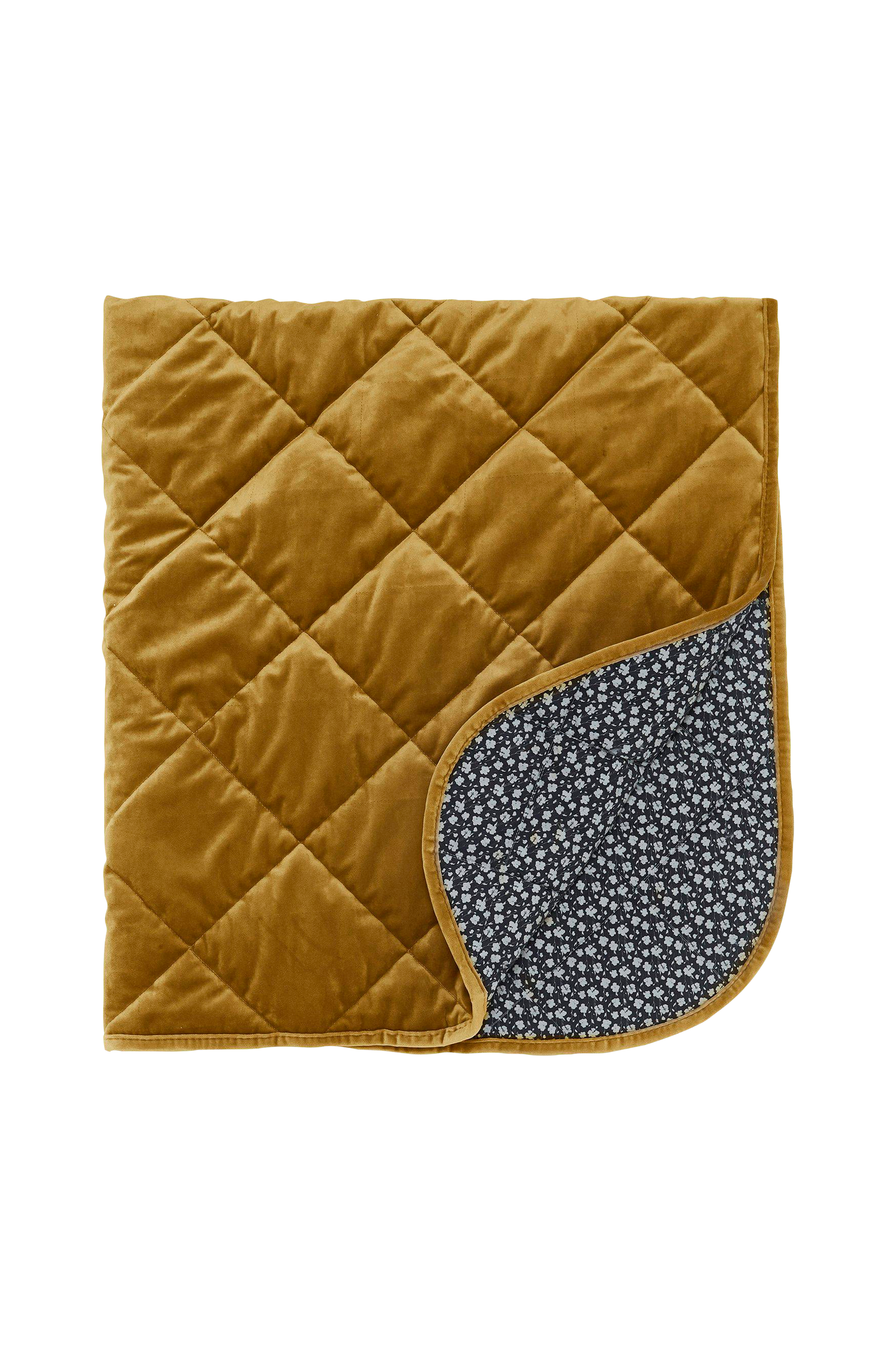 Emmet er et quiltet pledd med ensfarget fløyel på den ene siden og mykt bomullsstoff med trykt mønster på den andre siden. Mål 130x150 cm. 100% polyester.