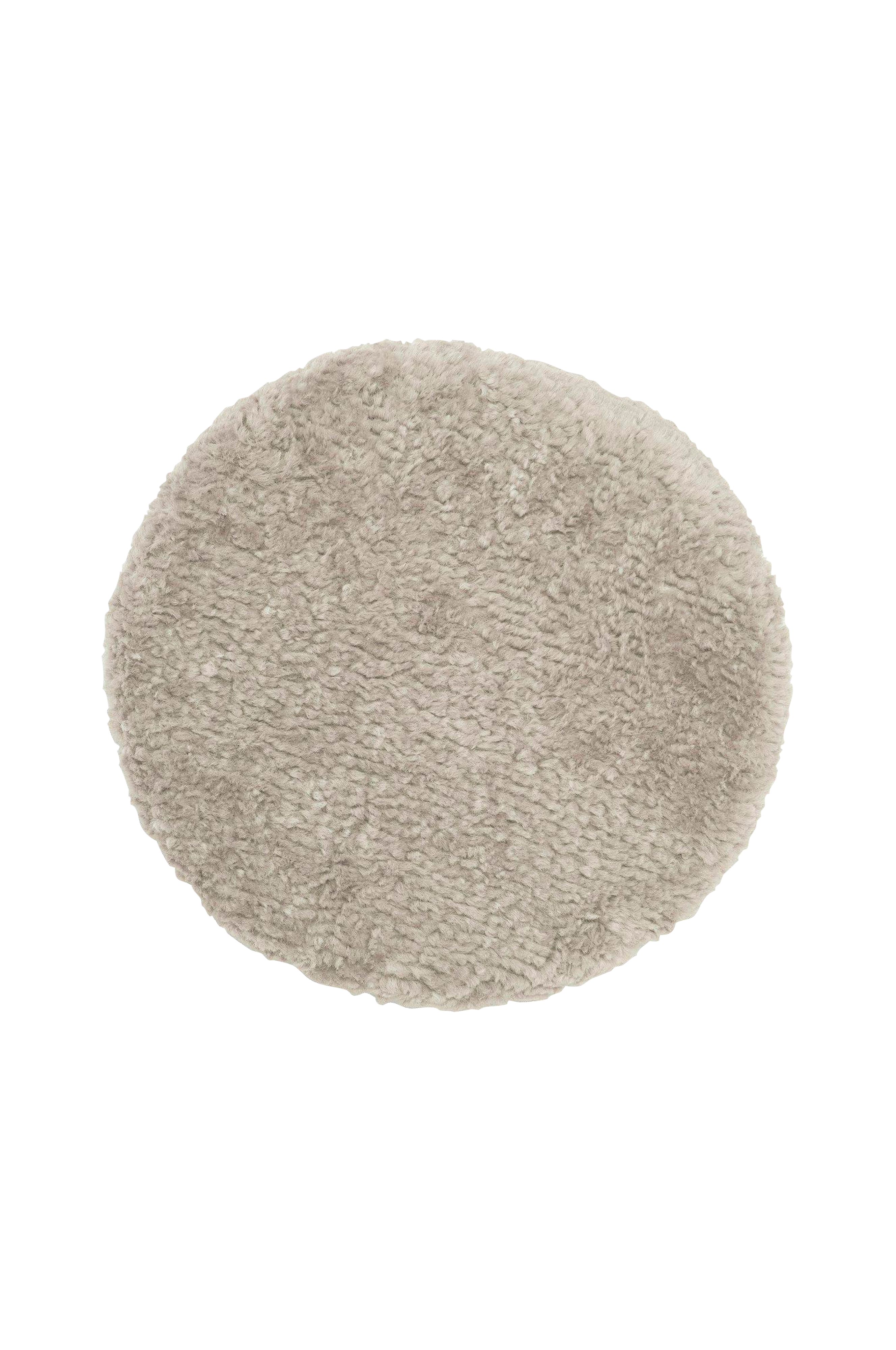 Rund stolpute i lodden saueskinnimitasjon på forsiden og mykt stoff på baksiden med antiskli. Puten er fylt med en skumplate. 100% polyester.