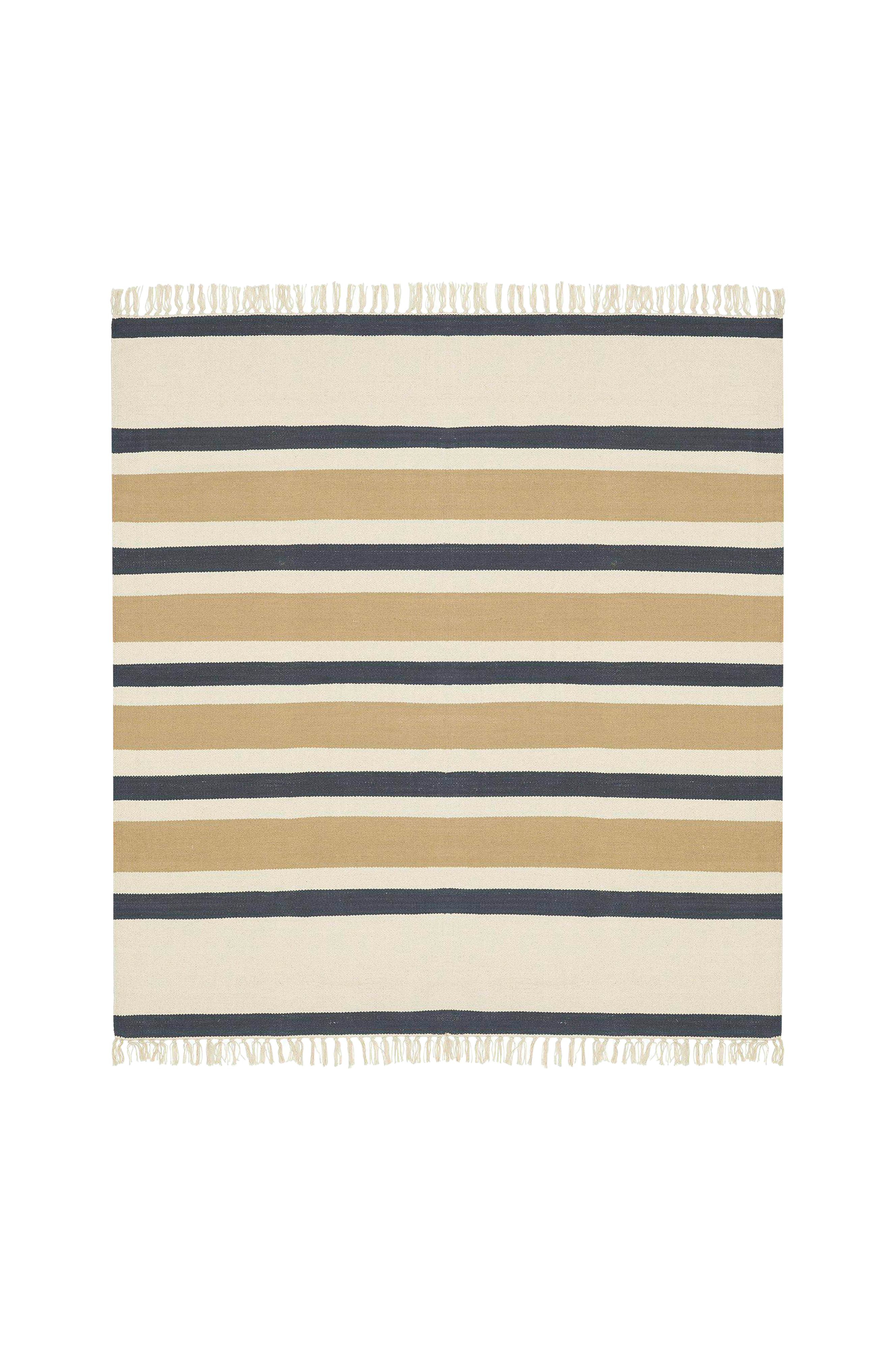 Vevd teppe i tynn bomullskvalitet med stripete mønster. Vi anbefaler antisklimatte under for at teppet skal ligge bedre mot gulvet og redusere sklifaren. 100% bomull.