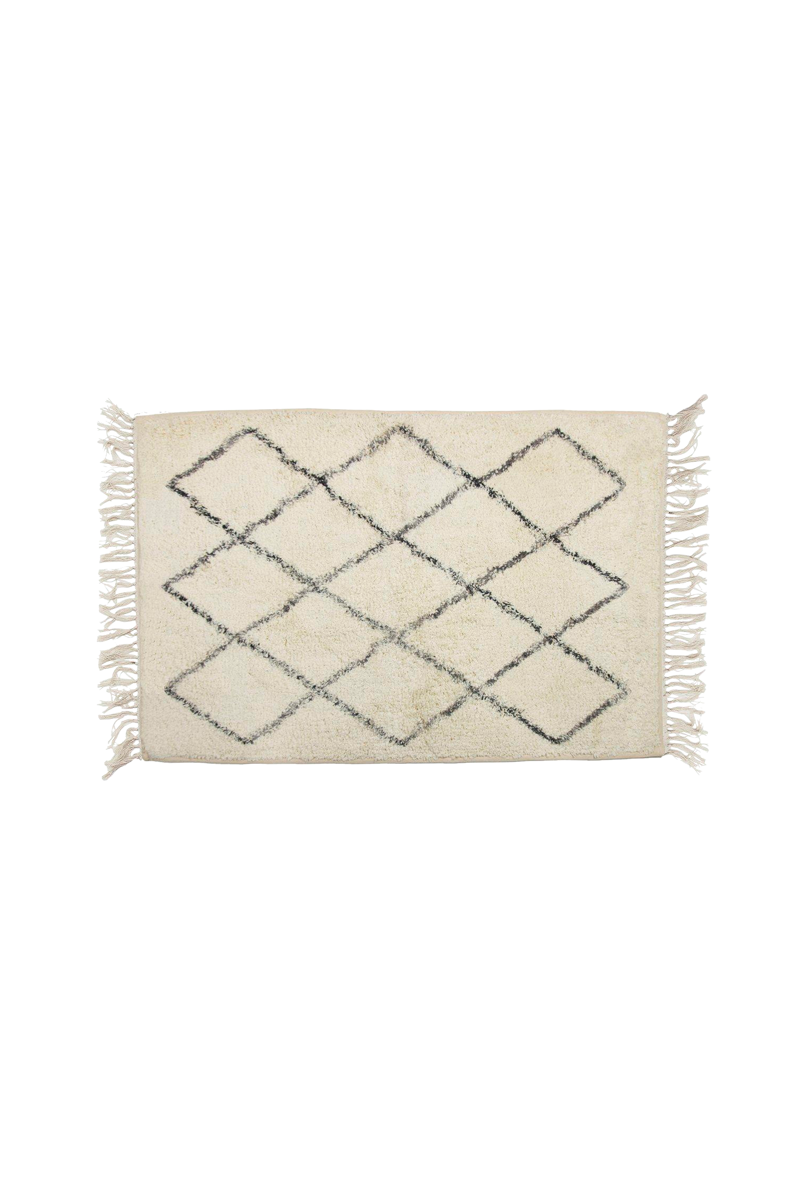 Herlig flosset teppe med frynser i kortsidene og kult grafisk trykk. Shaggy kommer i flere forskjellige størrelser. Siden teppet rulles sammen under frakt, kan det forekomme bretter. Disse forsvinner etter en stund. Husk at nye tepper loer en del i starten. Vi anbefaler at du støvsuger teppet regelmessig for å forkorte denne prosessen. For å redusere faren for å skli kan du godt kjøpe en antisklimatte til teppet. Mål 70x240 cm. 100 % bomull.