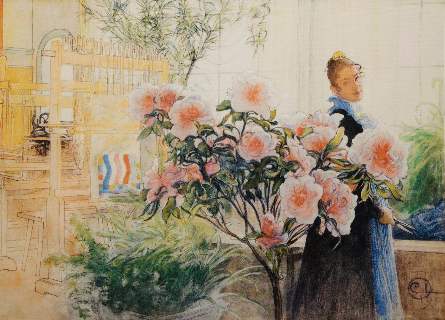 Veggdekor med maleri av Carl Larsson. Sydde kanter og med en kanal i overkant og underkant for enkelt oppheng.