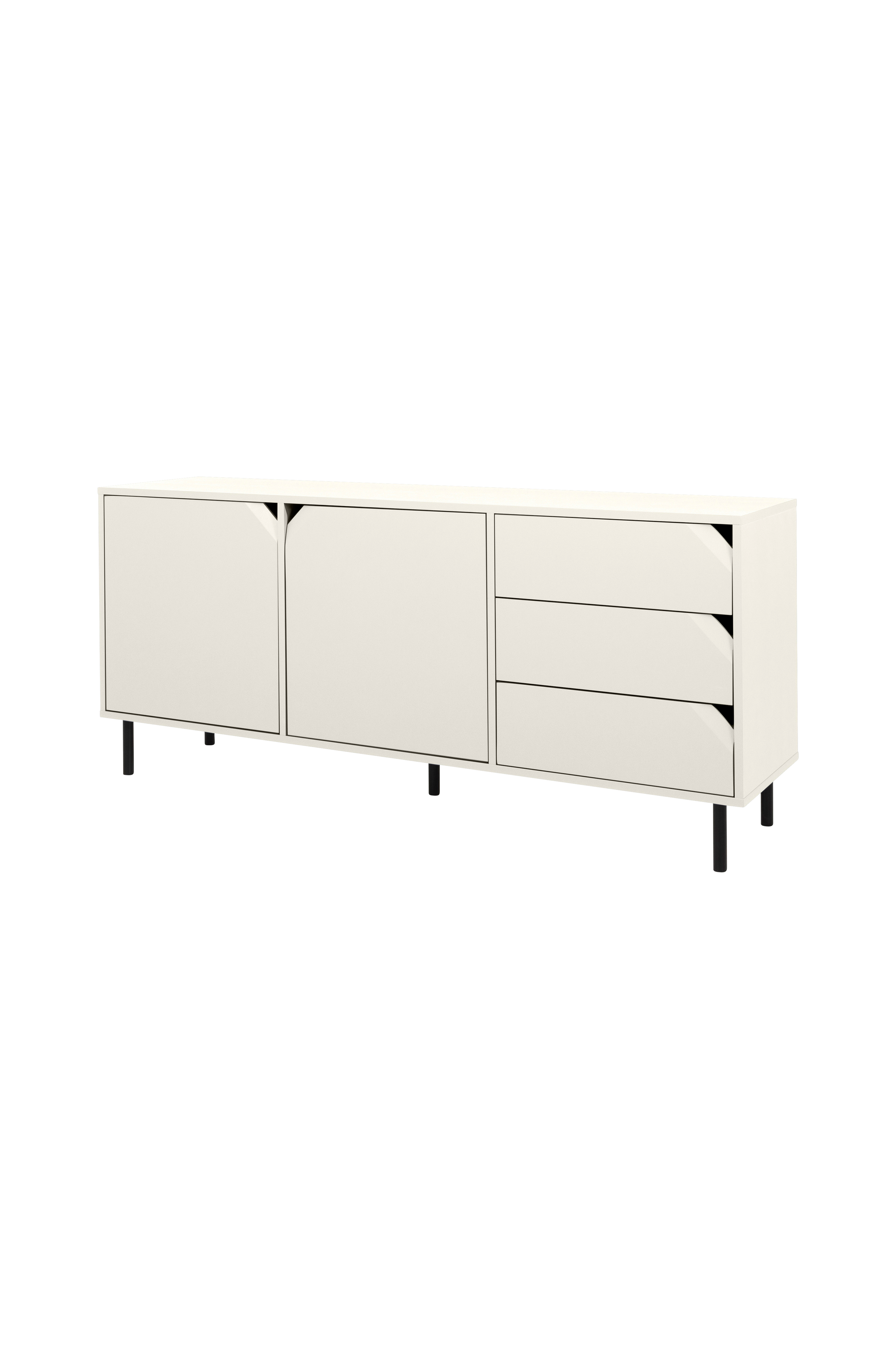 Skjenk med god oppbevaringsplass. Den er lett å plassere i mange rom, for eksempel stue, kjøkken eller soverom. Oppbevar for eksempel servise og andre kjøkkenartikler i skjenken. Den unike designen med sofistikerte håndtak i form av fasede og skrå hjørner gjør møblene lette å plassere i ethvert hjem. Skjenken har to dører, justerbare hyller på innsiden og 3 skuffer. Når dørene er åpne er baksiden svart, og skuffenes sider minner om lin når de dras ut. Møblene har svarte, dekorative ben i metall. Kan med fordel kombineres med Corner highboard. Produsert i Sverige av Tenzo. Krever montering, instruksjoner medfølger. Veltebeskyttelse. Designet av Jurij Rahimkulov.