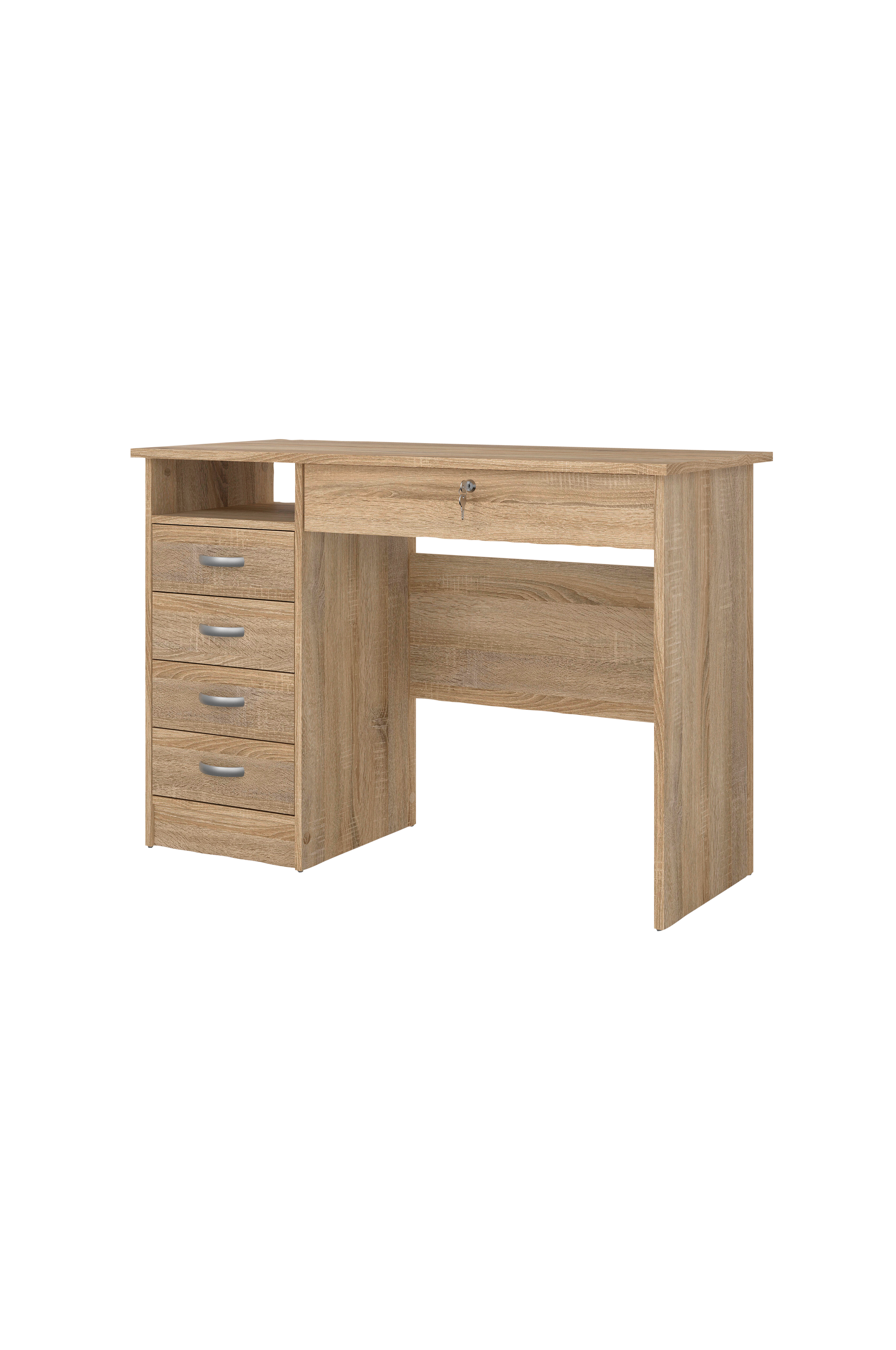 Function Plus-kontorpulten kombinerer sømløst moderne stil med praktisk funksjonalitet. Skrivebordet har en toppskuff med lås som gir en trygg oppbevaringsløsning. Med et åpent rom og fire skuffer sørger dette skrivebordet for rikelig og organisert oppbevaringsplass for en ryddig arbeidsplass.