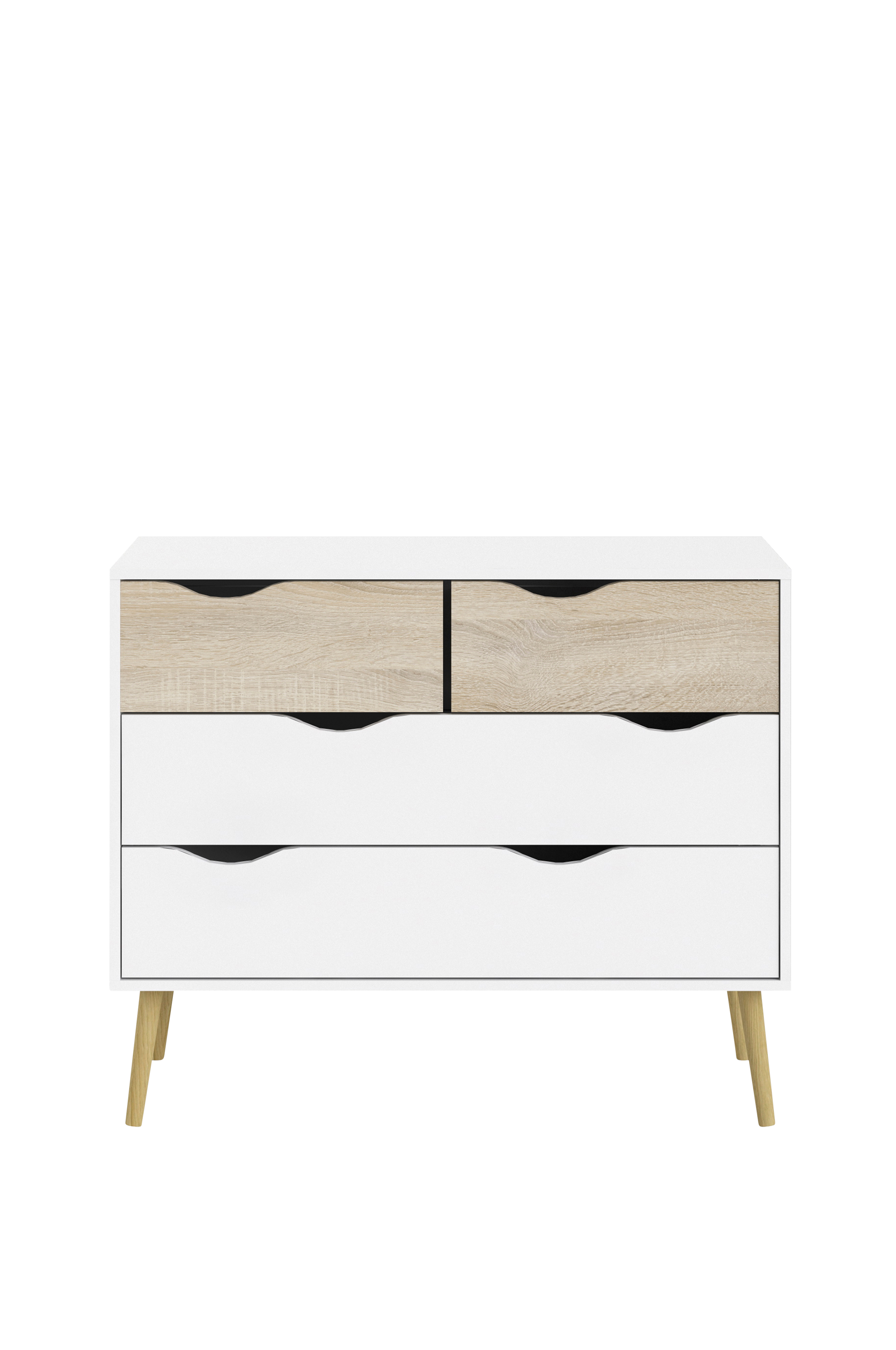 Designe drømmesoverommet med denne moderne, retroinspirerte kommoden med fire skuffer fra Tvilum. Oppdatert, moderne design i to farger, inspirert av 1950-tallet, med skuffefronter med utskjæring, uten håndtak, og skrå ben av tre. Produsert i Danmark. Kommoden har to små skuffer og to brede, hvite skuffer for å organisere alt fra sokker til gensere og nattøy. Kommode med fire skuffer, med kvalitative detaljer som rulleskinner av metall og folieflate som er enkel å rengjøre og resistent mot riper - noe som gjør at den ser ny ut lenger.