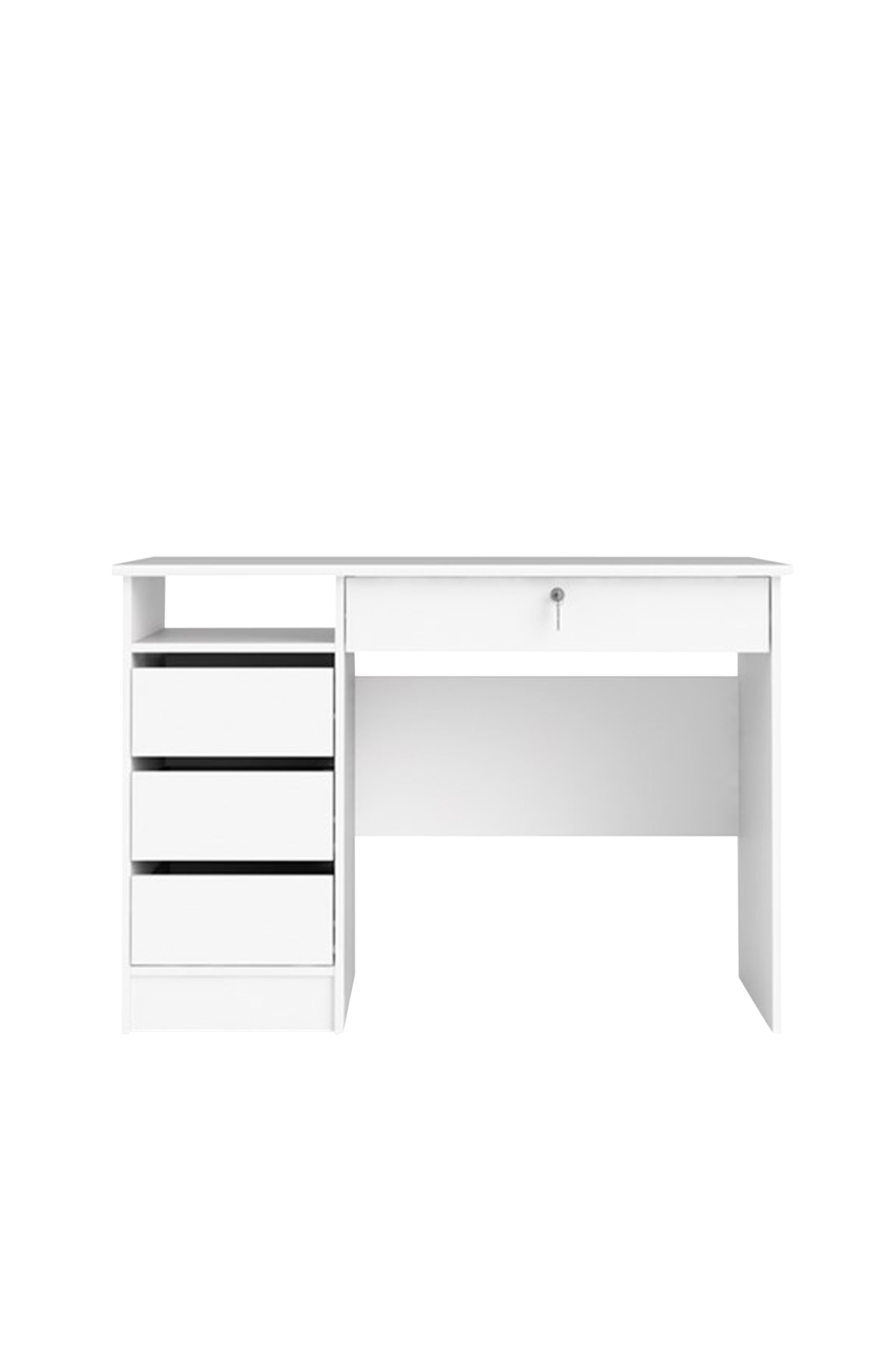 Dette funksjonelle, hvite skrivebordet med fire skuffer og et åpent rom er et utmerket komplement til hjemmekontoret, stua eller soverommet. Takket være den tidløse og enkle designen passer dette skrivebordet enkelt inn i både en moderne og klassisk interiørstil. Bordplaten gir fantastisk plass til å jobbe, studere eller være kreativ, og har god plass til laptop, bildeskjerm, skriver og penner. De fire praktiske skuffene gir enda mer oppbevaring for å organisere alle papirer og notatblokker, eller holde kontormateriell ute av syne.