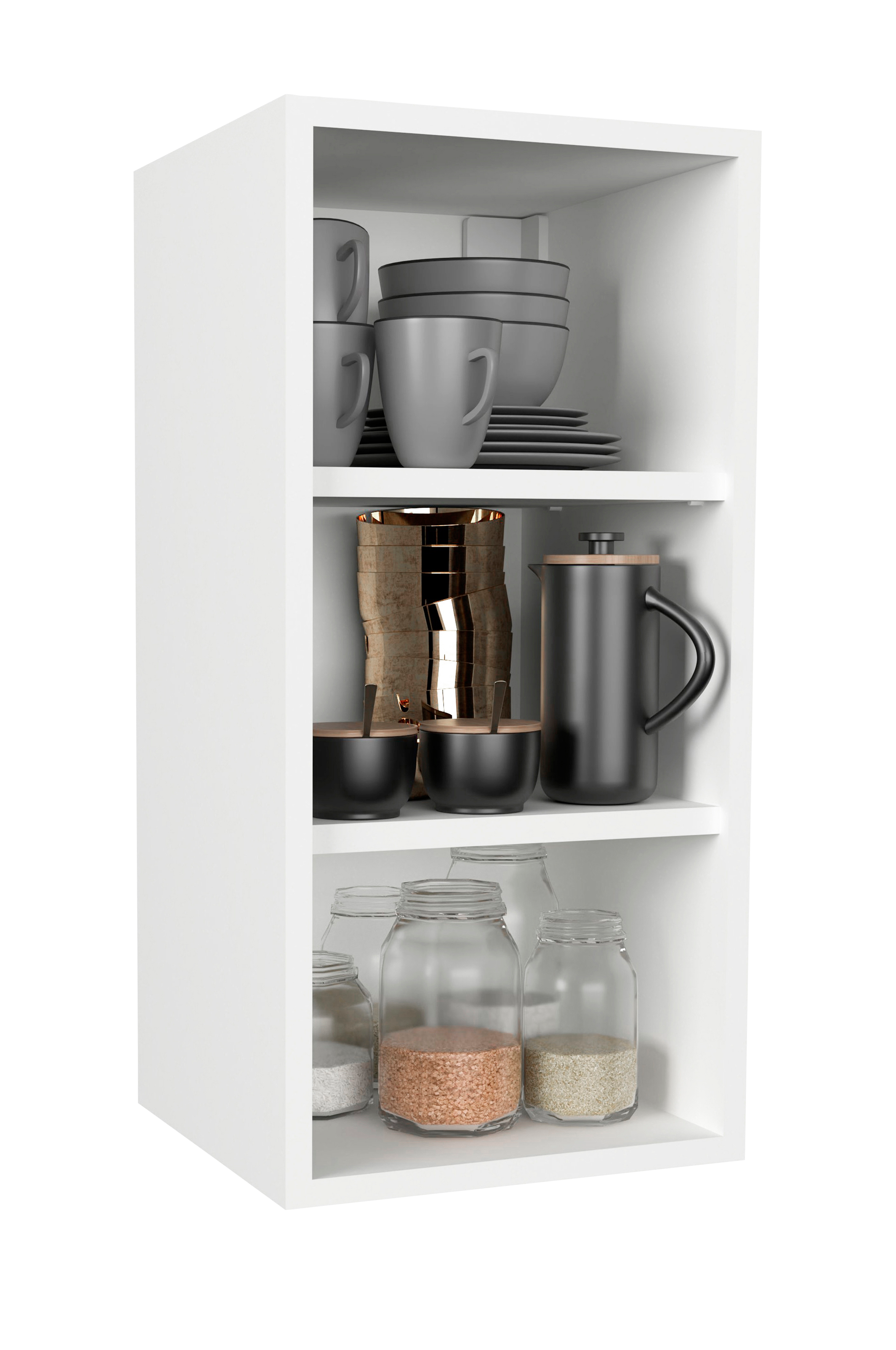 vcm veggskap med to hyller og tre rom er spesielt moderne og tilbyr rikelig med oppbevaringsplass for kjøkkenredskaper. Stommen er 16 mm tykk og derfor spesielt robust.