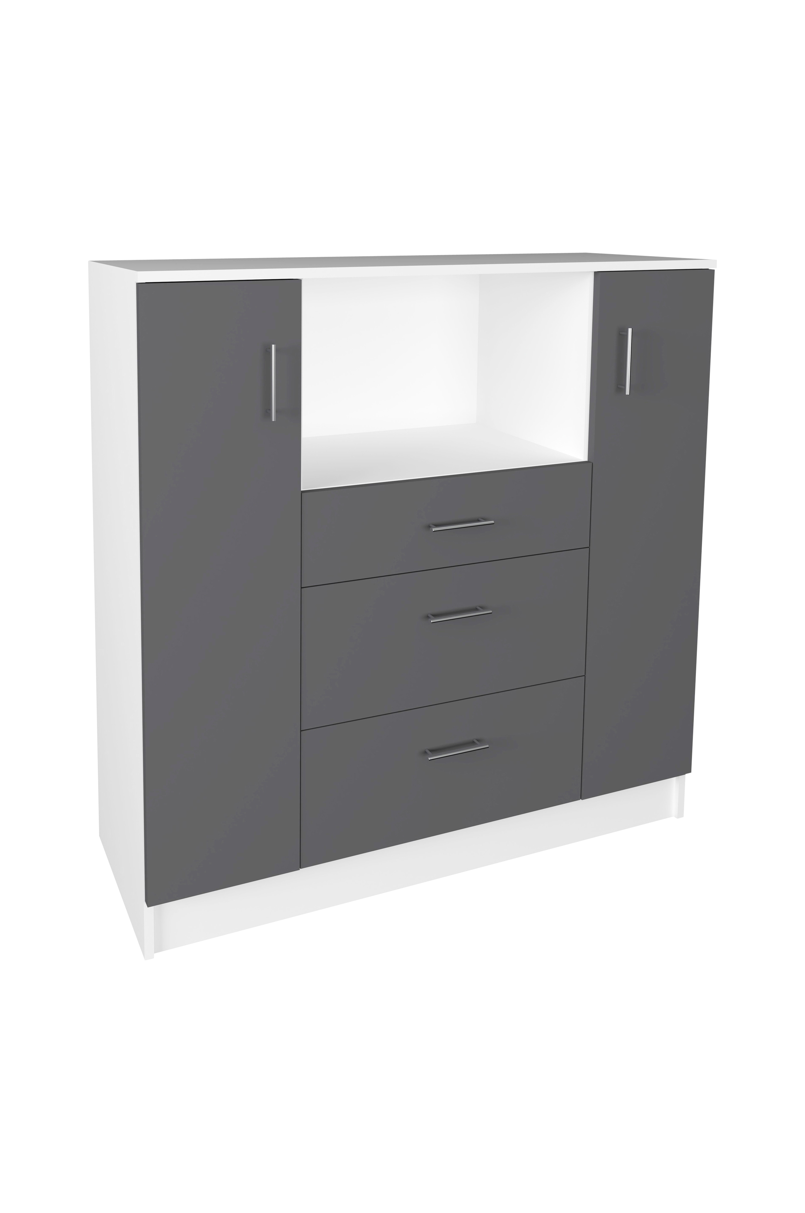 vcm kjøkkenskap med to hengslede dører og tre skuffer er spesielt moderne og tilbyr rikelig med oppbevaringsplass for kjøkkenredskaper. Korpusen er 16 mm tykk og derfor spesielt robust.