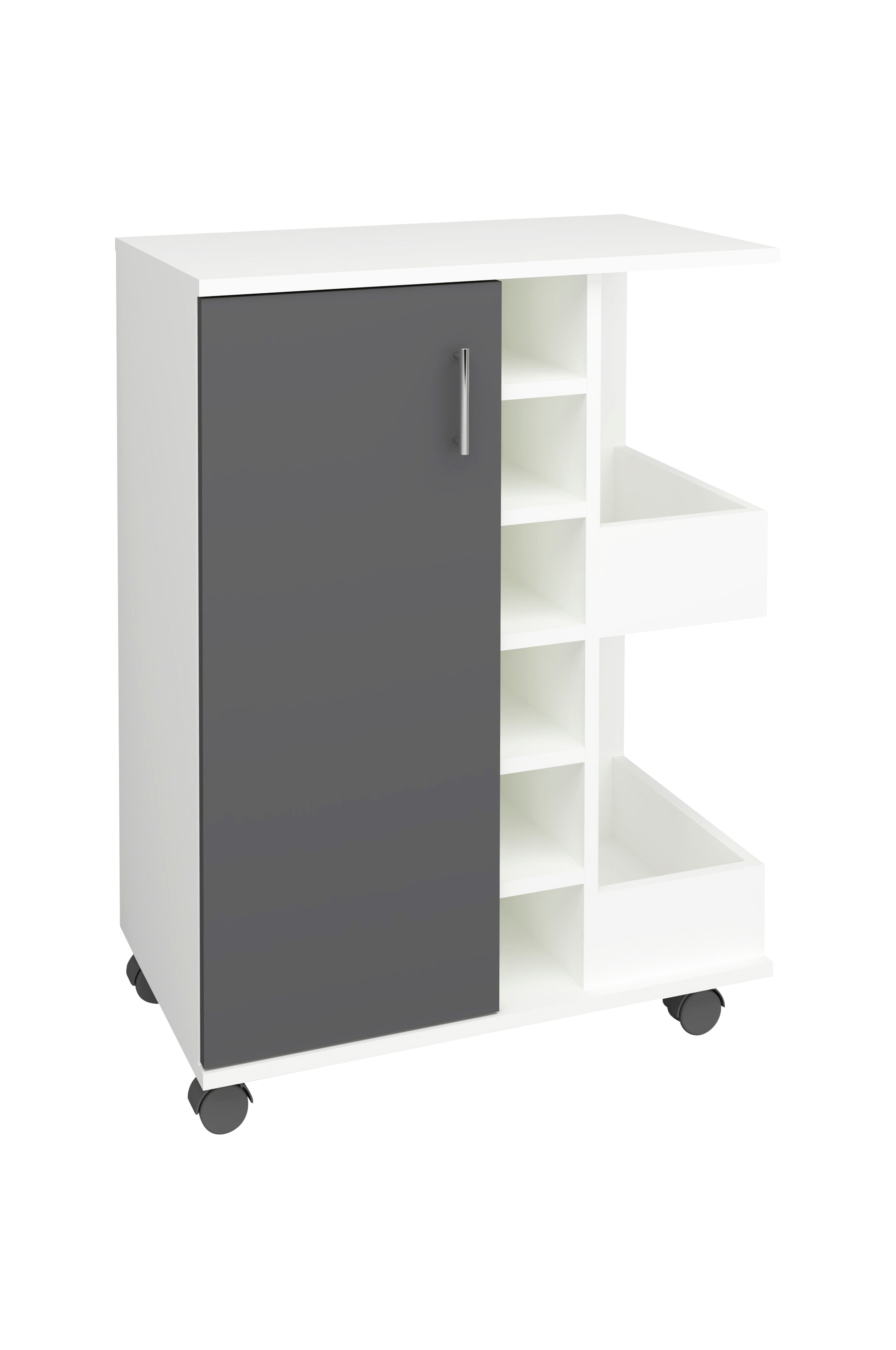 praktisk og romslig kjøkkenvogn for ekstra oppbevaringsplass på kjøkkenet. tre skuffer og tre åpne rom gjør den mobile serveringsvognen til et oppbevaringsmirakel.