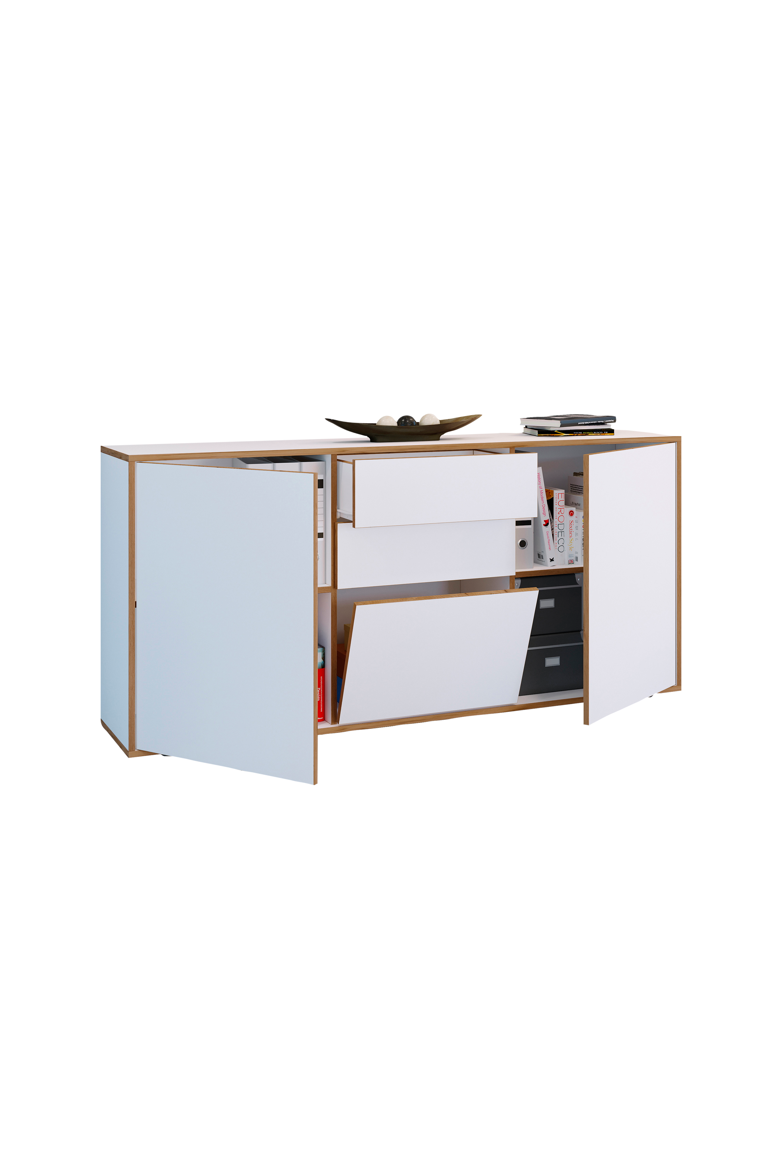 Møbelet er laget av robust tre og har et tidløst design. Hylleflaten har et robust melaminharpiksbelegg. Dette gjør produktet enkelt å rengjøre og sikrer lang levetid. Kommoden har to hengslede dører, en klaff og to skuffer, noe som gir rikelig med oppbevaringsplass. Dørene og skuffene har ingen håndtak og kan åpnes med den moderne push-to-open-funksjonen.