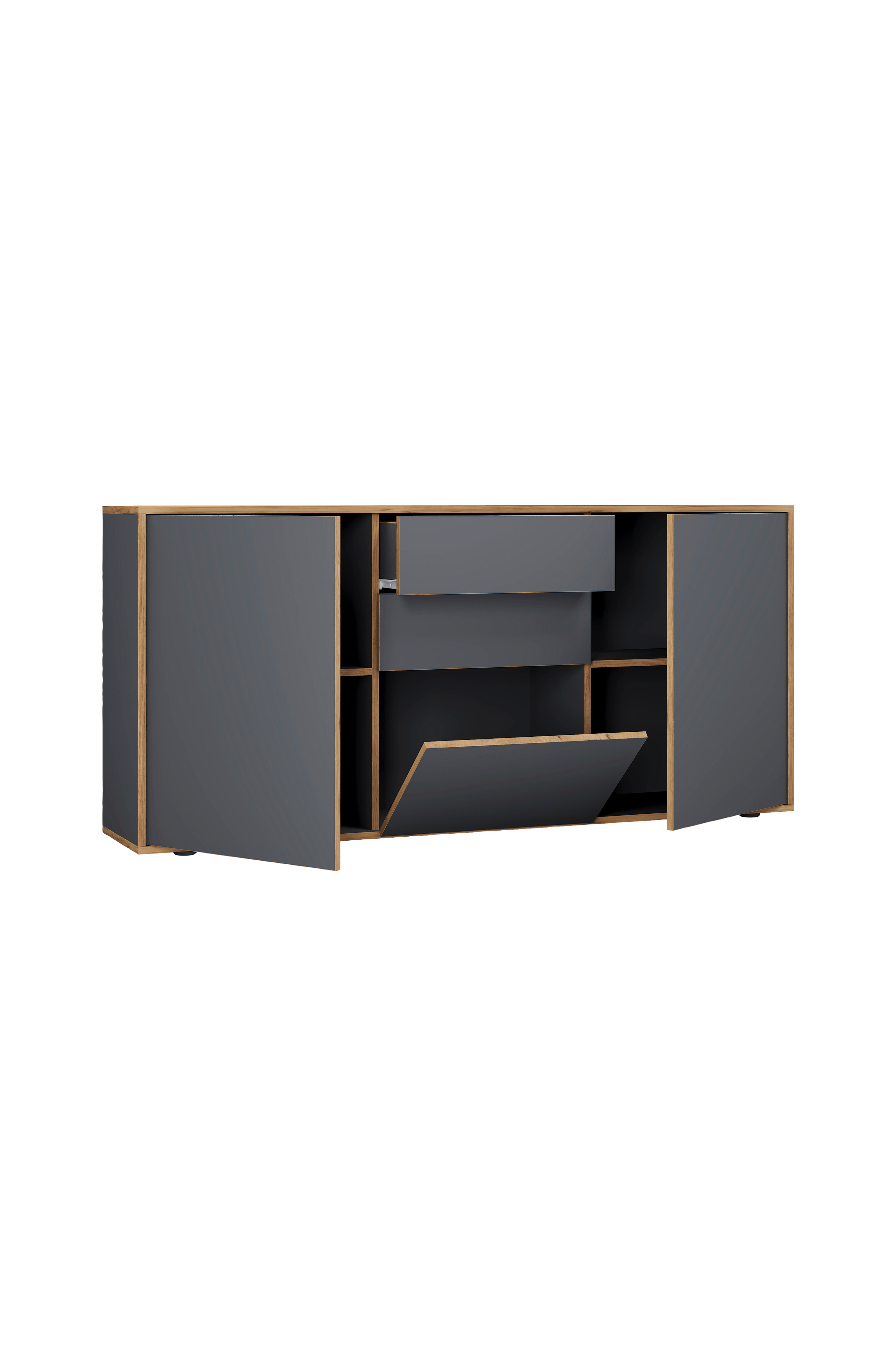 Møbelet er laget av robust tre og har et tidløst design. Hylleflaten har et robust melaminharpiksbelegg. Dette gjør produktet enkelt å rengjøre og sikrer lang levetid. Kommoden har to hengslede dører, en klaff og to skuffer, noe som gir rikelig med oppbevaringsplass. Dørene og skuffene har ingen håndtak og kan åpnes med den moderne push-to-open-funksjonen.