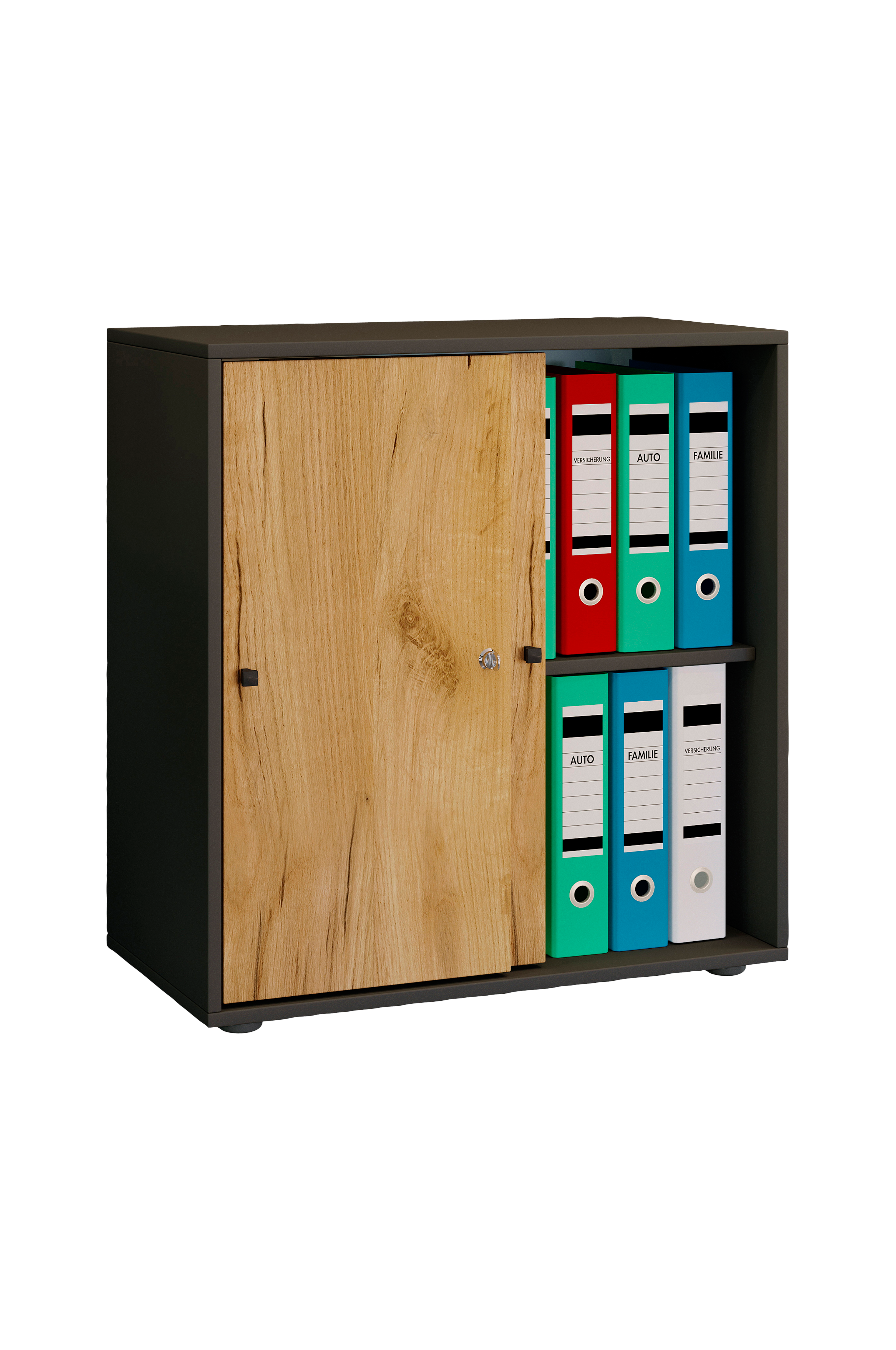 vcm kontorskap "lona l" har to skyvedører, en variabel hylle og nok plass til 14 mapper og andre redskaper. Korpuset er laget av en reproduksjon av trestruktur og har en stabil bakplate.