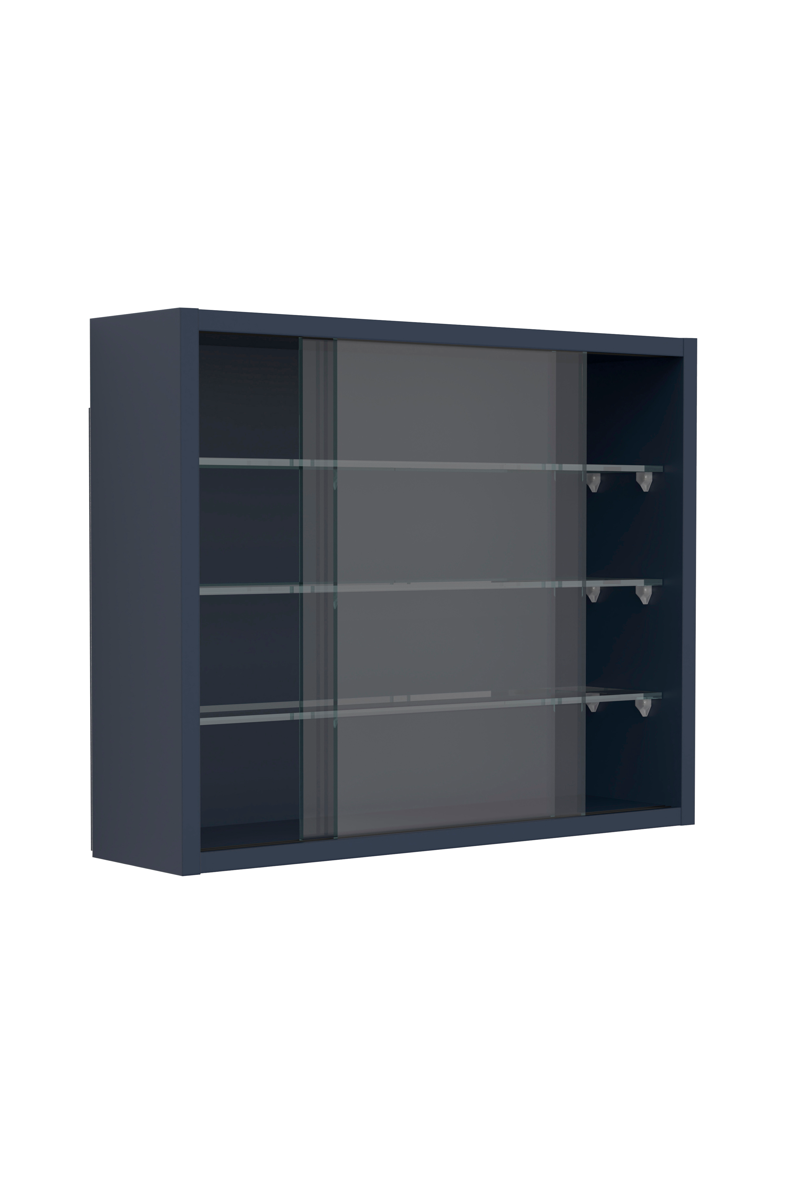 Tre glasshyller skaper fire rom som gir rikelig med oversiktlig oppbevaringsplass. To skyvedører i glass holder støvet ute fra interiøret, slik at dekorasjoner og gjenstander kan vises frem på en vakker måte.