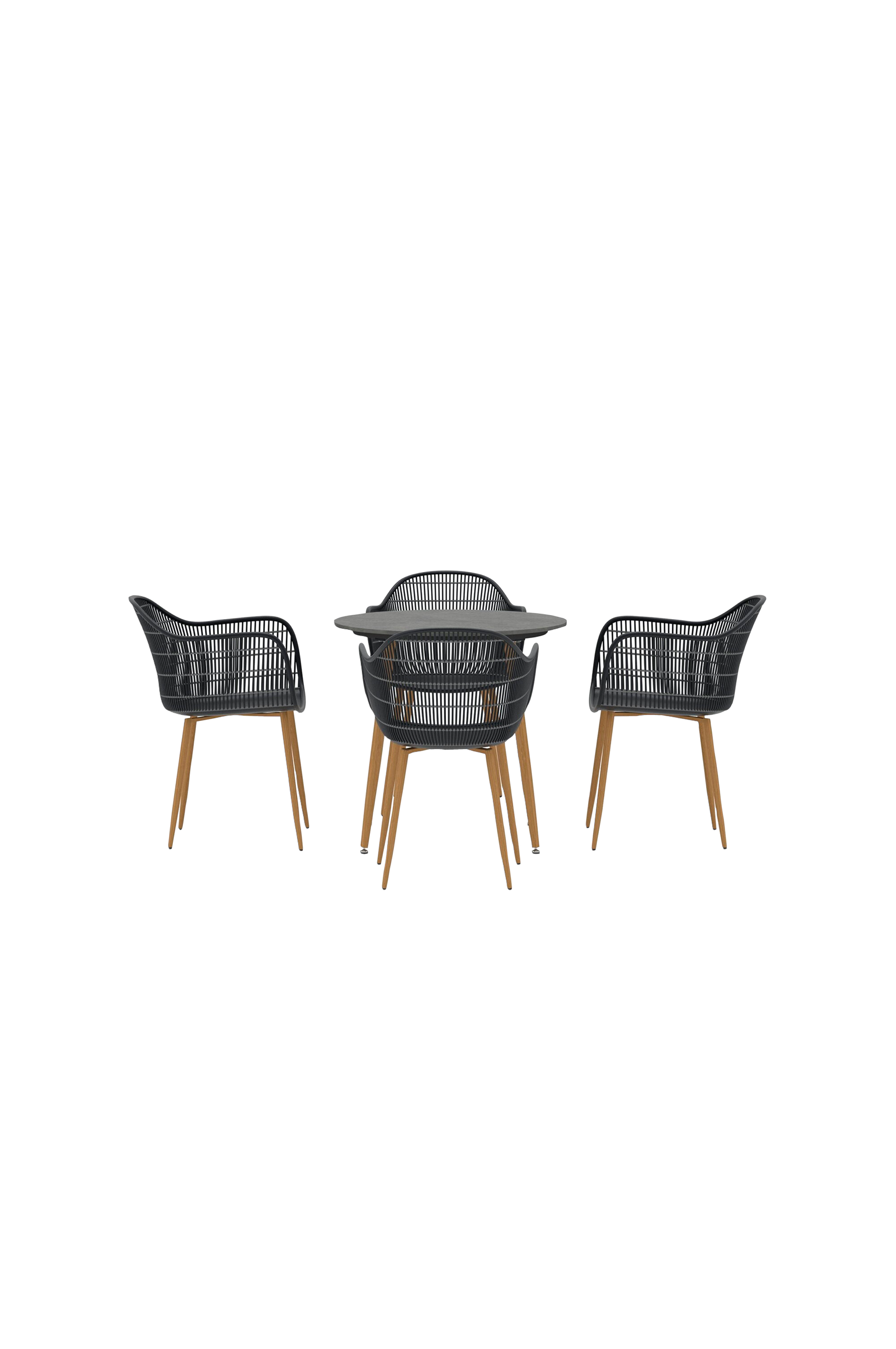 Anafi er et stilrent spisebordssett som kombinerer moderne design med høy komfort. Settet består av et rundt bord med en elegant bordplate og fire stoler med omfavnende rygglener og komfortable puter. Den svarte fargen og de raffinerte detaljene gir settet et eksklusivt uttrykk som forsterker atmosfæren på terrassen, balkongen eller i hagen.
