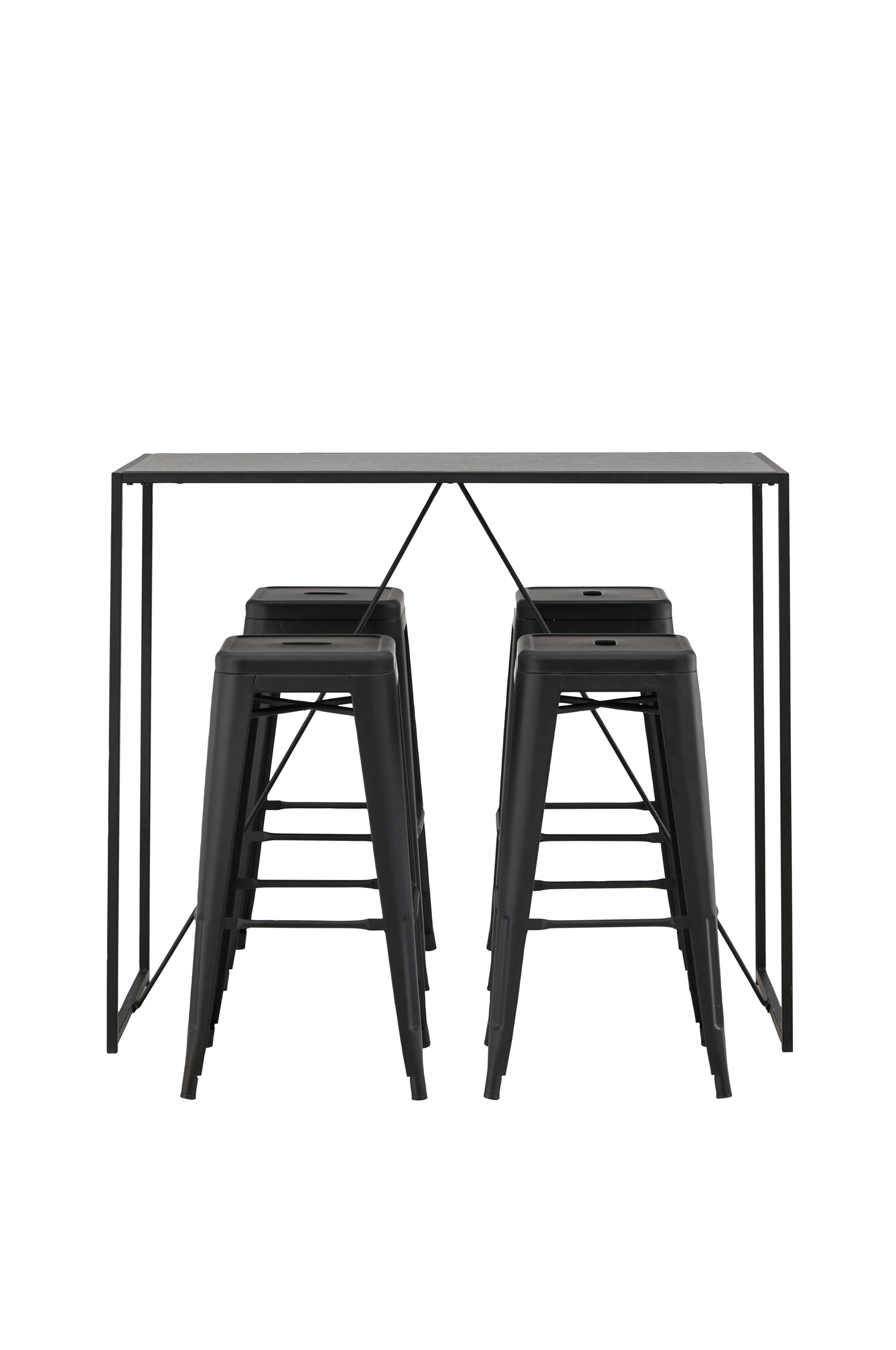 En stilren og trendy bargruppe for fire! Her er barstolene Tempe kombinert med barbordet Brea som gir et moderne og industrielt uttrykk. Barstolen har en klassisk utforming som en høyere krakk med lett utsvingte ben, sete av stål og ramme for fotstøtte. Barbordet har en trendsikker skandinavisk design i minimalistisk struktur med en tynn bordplate i MDF og en smal rammekonstruksjon av stål. Denne bargruppen er perfekt for deg som foretrekker høyere sitteplasser på kjøkkenet eller har åpen planløsning på kjøkkenet og ønsker sittende selskap når du lager mat.