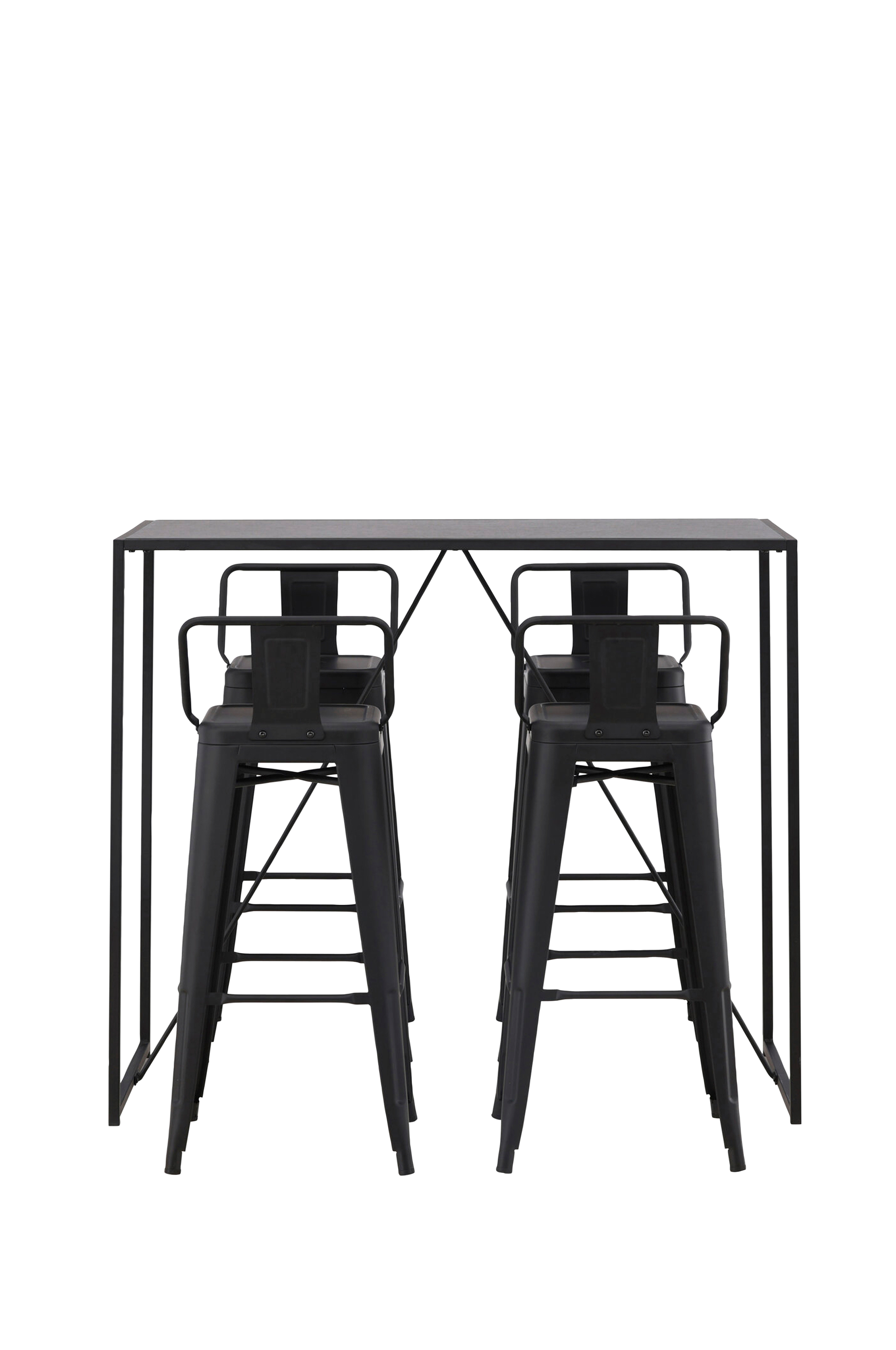 En stilren og trendy bargruppe for fire! Her er barstolene Tempe kombinert med barbordet Brea som gir et moderne og industrielt uttrykk. Barstolen har en klassisk utfroming som en høy krakk med lett utsvingte ben, sete med lav rygg av stål og en ramme for fotstøtte. Barbordet har en trendsikker skandinavisk design i minimalistisk struktur med en tynn bordplate i MDF og en smal rammekonstruksjon av stål. Denne bargruppen er perfekt for deg som foretrekker høyere sitteplasser på kjøkkenet eller har åpen planløsning på kjøkkenet og ønsker sittende selskap når du lager mat.