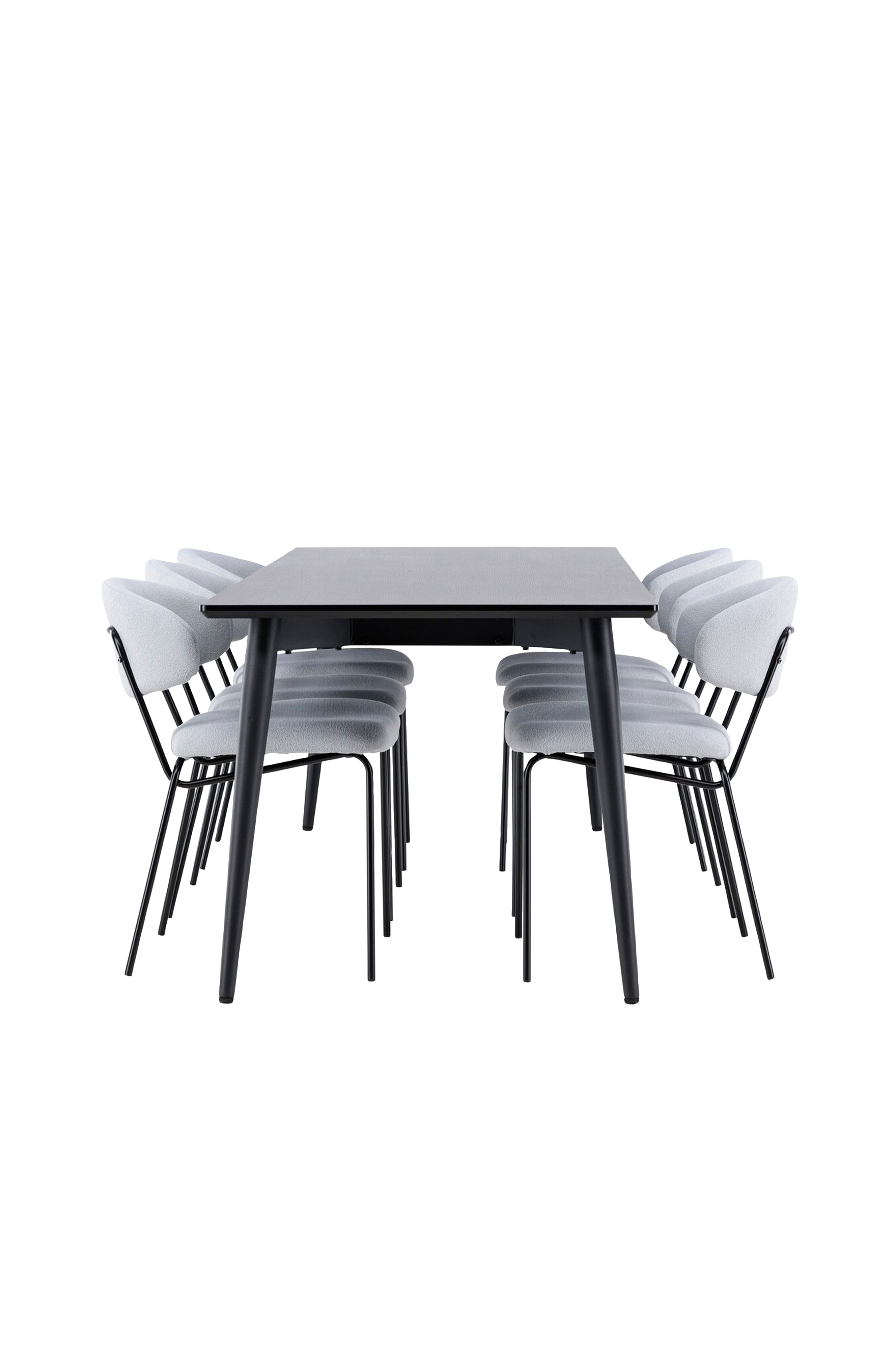 Forvandle spisestuen din med et elegant spisebordssett som kombinerer stil og funksjonalitet. Dette spisestuesettet, som består av de sofistikerte chico-stolene og det robuste ellis-spisebordet, er perfekt for å skape en innbydende og moderne atmosfære i hjemmet ditt. Oppdag chico - den elegante stolen som vil løfte stemningen i spisestuen din. Stolens sete er trukket i bouclé og bena er laget av stål, noe som skaper en imponerende kontrast. Chico leveres i en praktisk pakke med to stoler. Med chico-stolen kan du skape en varm og innbydende følelse i spisestuen. Den gjennomtenkte designen og det imponerende utseendet gjør den til et perfekt møbel for å skape en atmosfære av eleganse og stil. Oppgrader spisestuen med det imponerende og gjennomtenkte stolparet chico. Utforsk ellis - det robuste spisebordet som vil bli midtpunktet i spisemiljøet ditt. Med sitt design tilfører ellis et elegant og moderne preg til rommet ditt. Bordet er laget med stålben og en bordplate i mdf, noe som gir en perfekt balanse mellom robusthet og stil. Med sine generøse mål på 230 x 85 cm er ellis-bordet perfekt for sosiale middager og sammenkomster med venner og familie. Den robuste konstruksjonen og det elegante designet gjør det til et pålitelig møbel som passer til alle anledninger. Enten du bruker det til å nyte en familiemiddag eller til å arrangere en fest, vil ellis skape en trendy og stilfull atmosfære i hjemmet ditt. Med chico-stolene og ellis-spisebordet får du et spisebordssett som kombinerer estetikk og funksjonalitet på beste måte. Oppgrader spisestuen din med dette elegante og allsidige spisestuesettet.