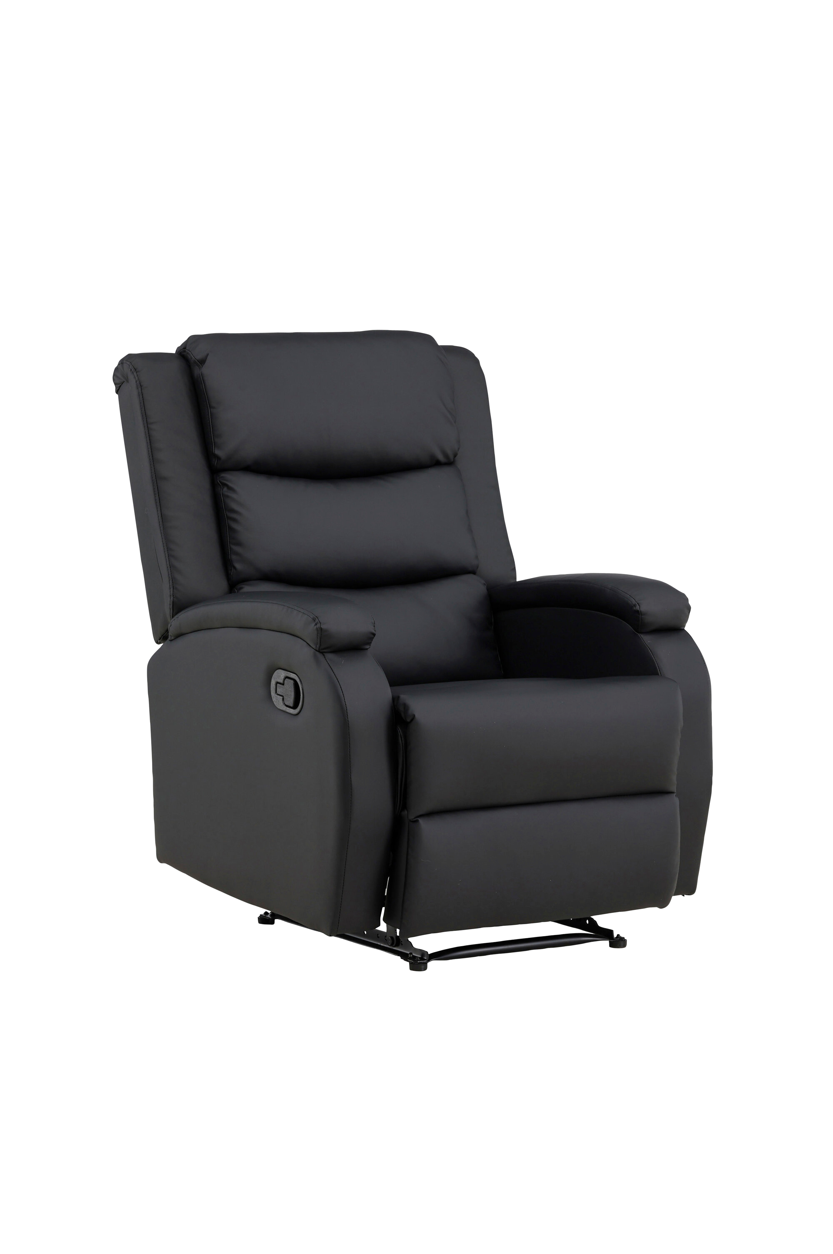 Trinnløst fellbar lenestol i PU, et skinnlignende materiale. Lenestolen har komfortable armlener og fotskammel. Mål på lenestolen: Bredde: 74 cm. Høyde: 103 cm. Dybde: 92 cm. Sittehøyde: 46,5 cm. Krever enklere montering.