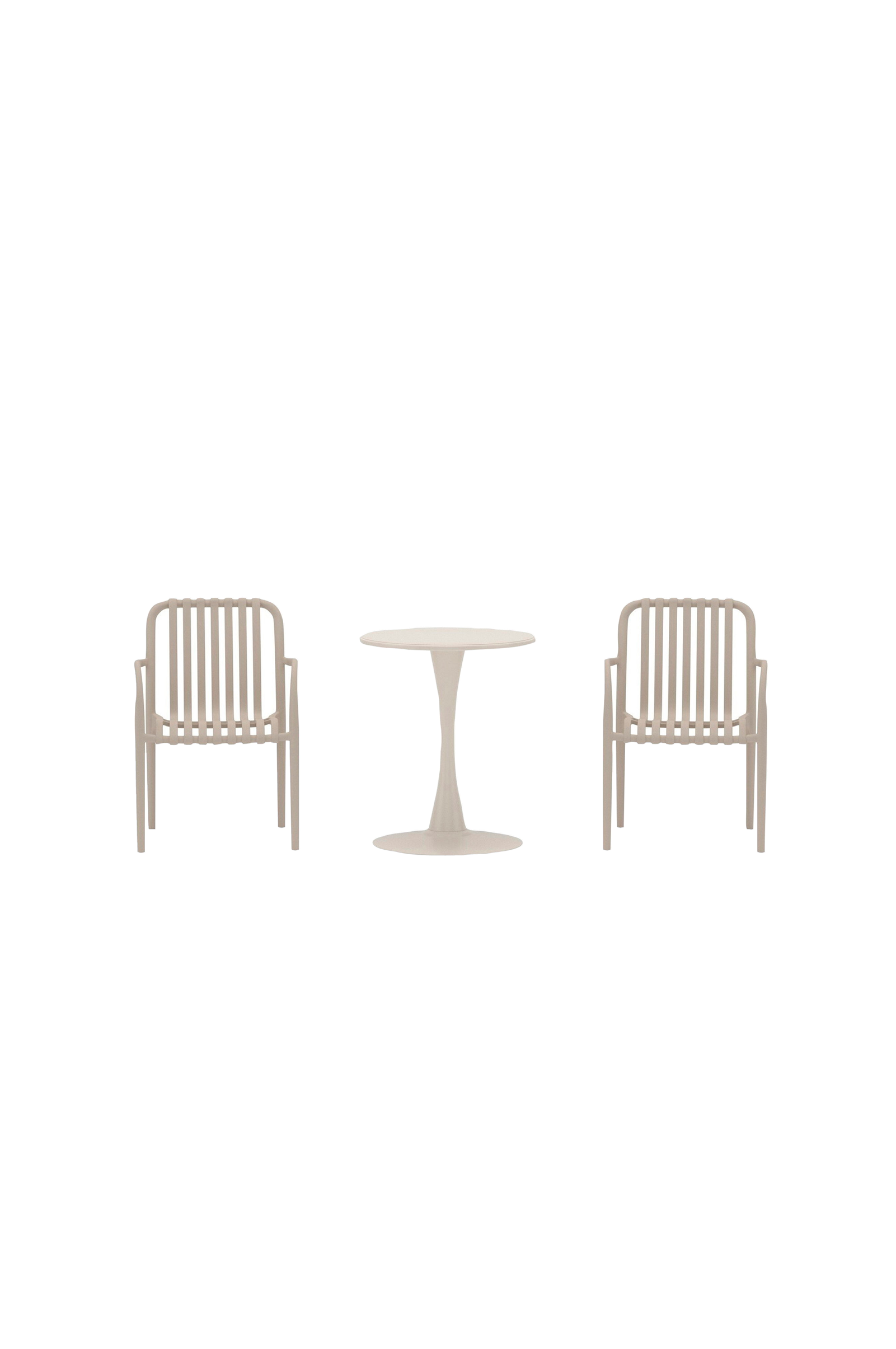 Limnos kafésett i beige er en stilfull og praktisk løsning for balkongen, uteplassen eller hagen. Settet består av to komfortable stoler og et rundt bord i en sammenhengende design som skaper et moderne og harmonisk uttrykk. Den tidløse beigefargen gjør at limnos lett smelter inn i ulike miljøer og blir et innbydende sted for kaffe, frokost eller en stille stund i solen.