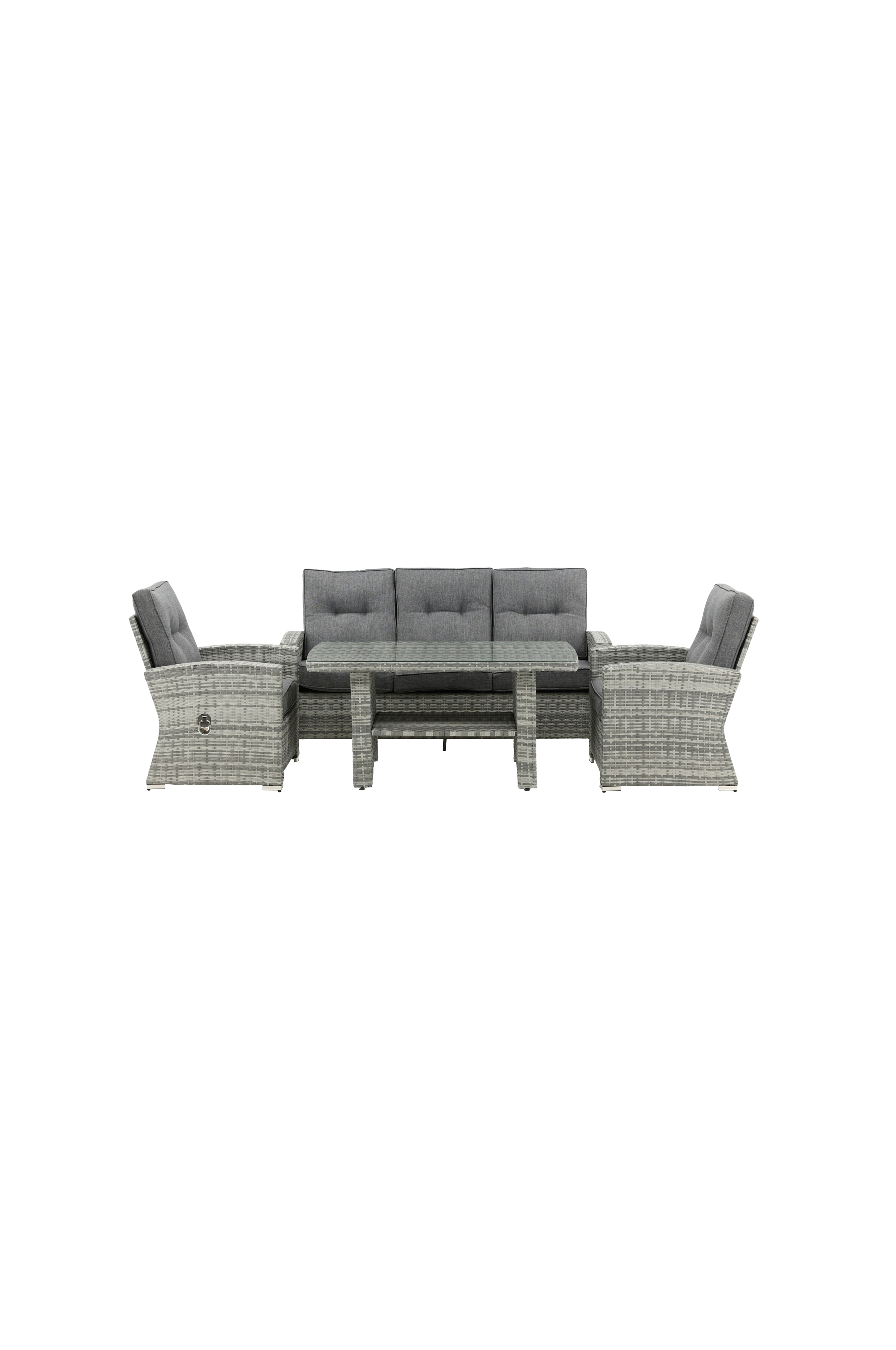 Skap et koselig hjørne på altanen i sommer med denne sofagruppen fra serien Padova! I sofagruppe følger det en 3-seter sofa, to reclinere samt et høyt sofabord med bordplate i glass. Gjennomgående produsert i det utendørsbestandige materialet kunstrotting i lekker farge. Pikerte myke puter inkludert. Sitt behagelig og nyt herlige kvelder i sommer!