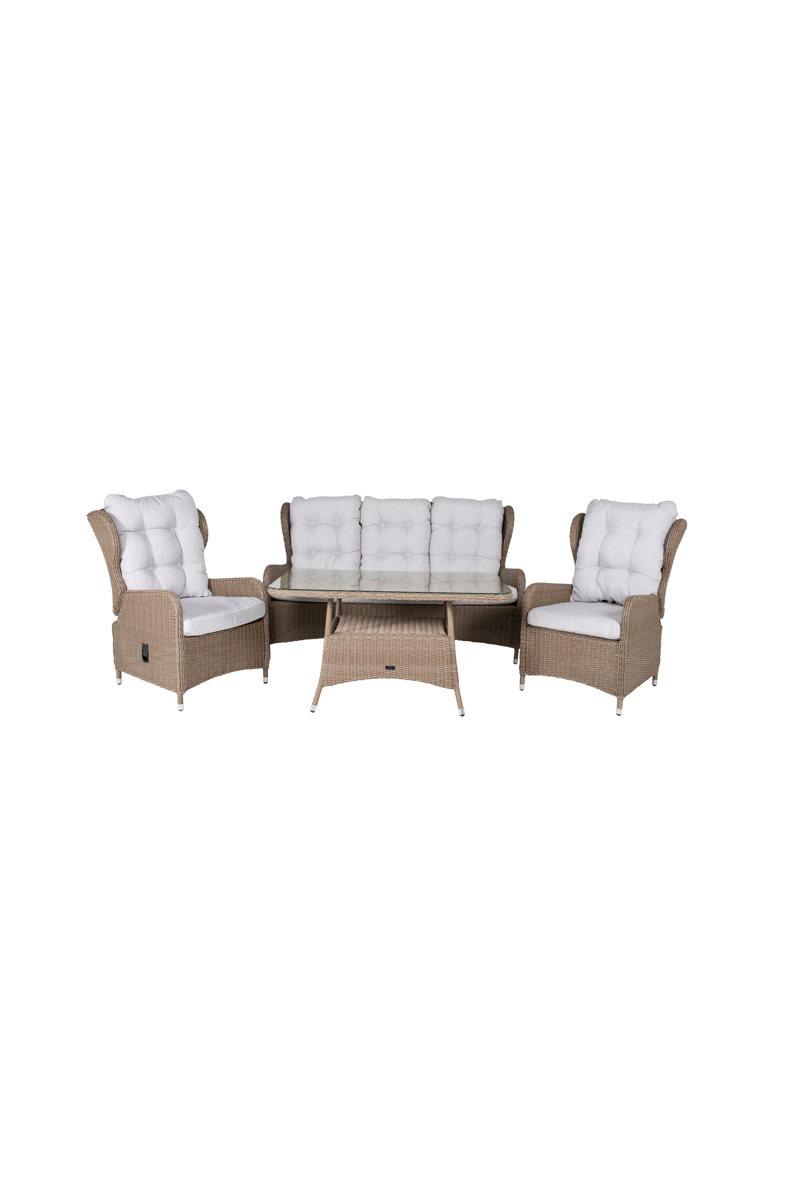Eksklusivt loungesett med en kombinasjon av tidløs design og en fantastisk komfort til uteplassen eller altanen. Sofagruppen består av en 3-seter sofa, to reclinere samt et høyt sofabord med avlastningshylle og bordplate av glass. Produsert i kunstrotting med aluminiumstamme. Inkludert myke, tykkpikerte puter.