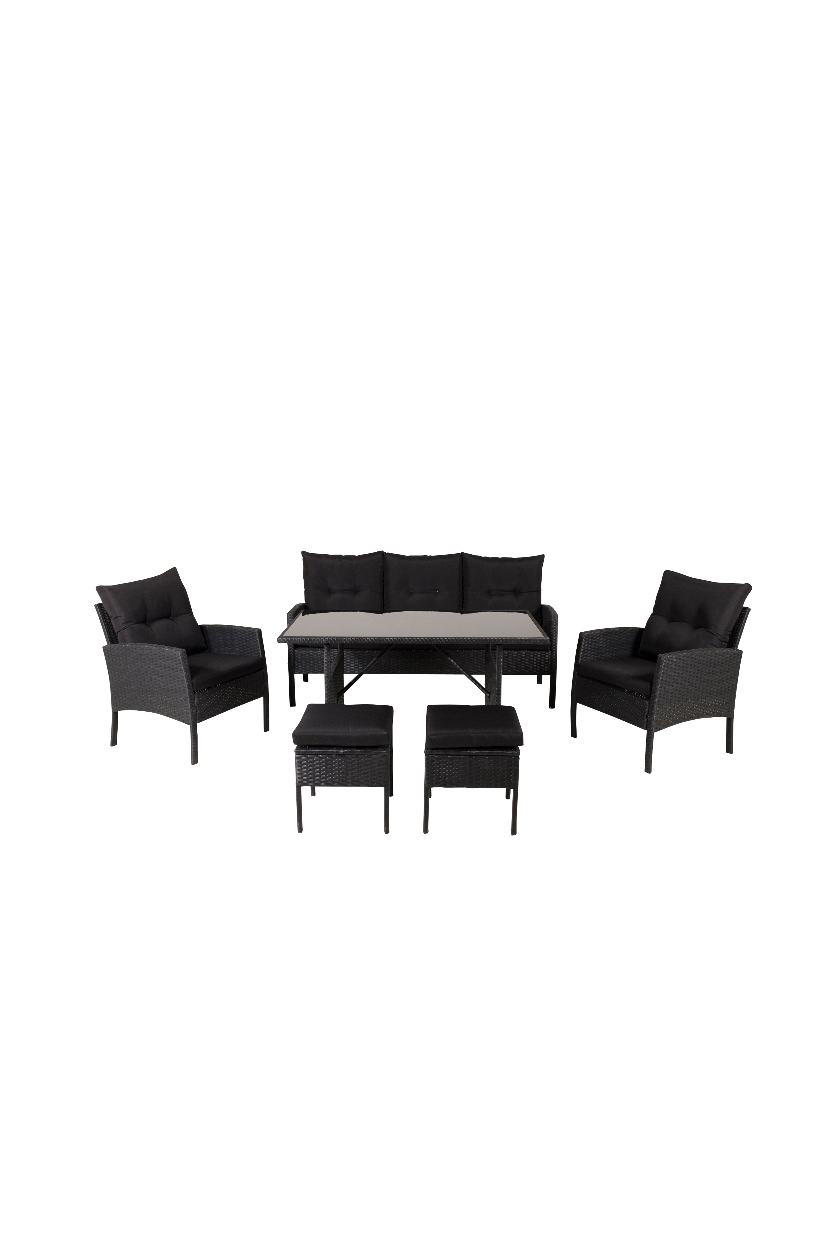 Knock skaper et innbydende blikkfang på uteplassen! En moderne allsidig sofagruppe i kunstrotting som passer utmerket både til altanen eller uterommet. Sofagruppen består av en treseters sofa, to armstoler samt to krakker, inkludert pikerte, myke puter og et rektangulært spisebord med bordplate av glass. Noe montering kreves. Tips: Krakkene kan brukes som ekstra sitteplass eller fotskammel til lenestolene eller sofaen.