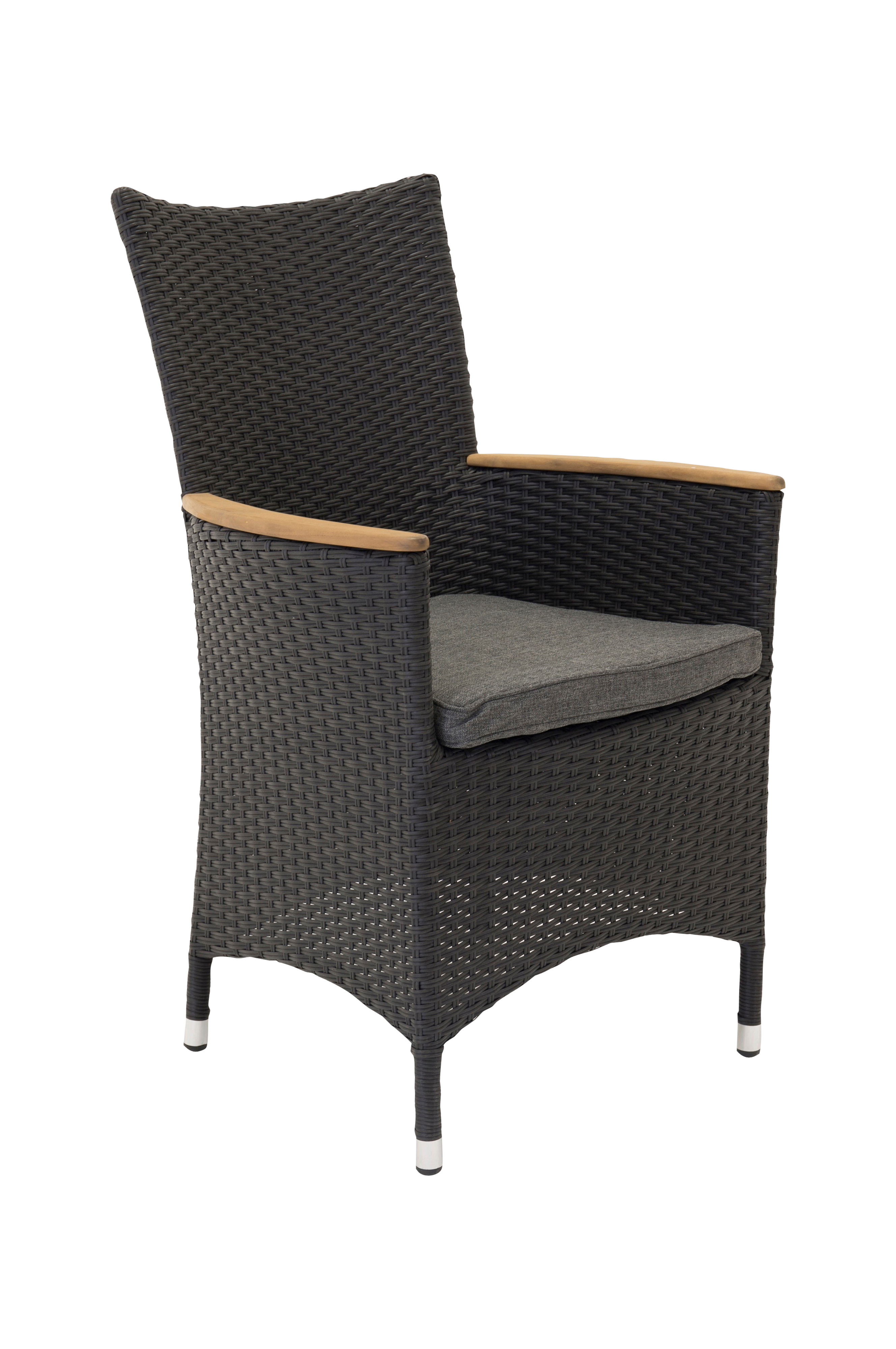 Skap et moderne blikkfang på uteplassen i sommer! Lekker armstol fra serien Malin hvor du kan nyte mange middager sammen med kjente og kjære om sommeren. Med stamme i aluminium og kunstrotting får du en robust og solid stol som varer. Armlener i tre som lekker detalj. Sitt behagelig i sommer og nyt herlige måltider utendørs!
