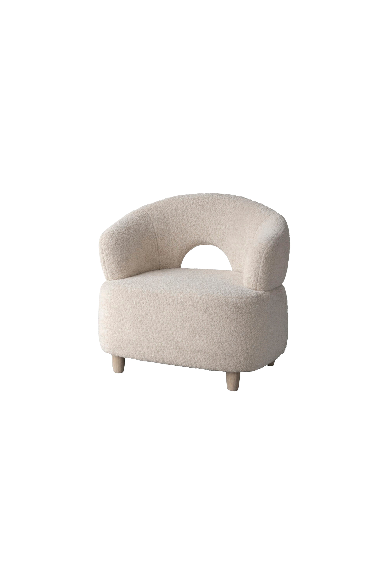 Moglas er en stilfull lenestol med avrundet design og hvitt bouclétrekk som skaper en varm og innbydende følelse. Den åpne ryggen gir et moderne preg, noe som gjør lenestolen like vakker som den er komfortabel.