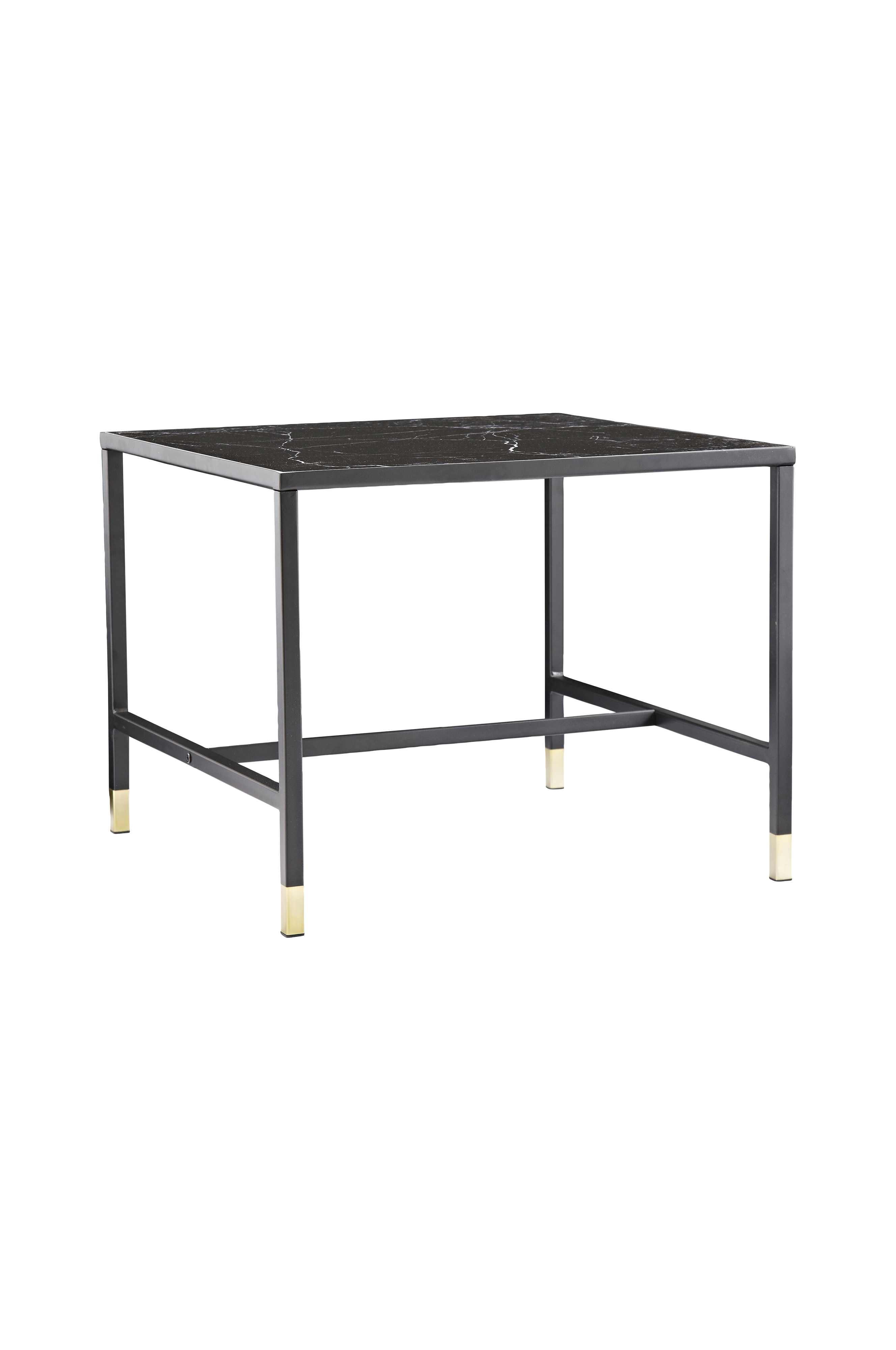 Firkantet bord med eksklusiv bordplate i glass med marmorlook, og ben av svart metall som har fine, børstede messingdetaljer nederst. Bredde: 60 cm. Høyde: 48 cm. Lengde: 60 cm. Krever enklere montering.