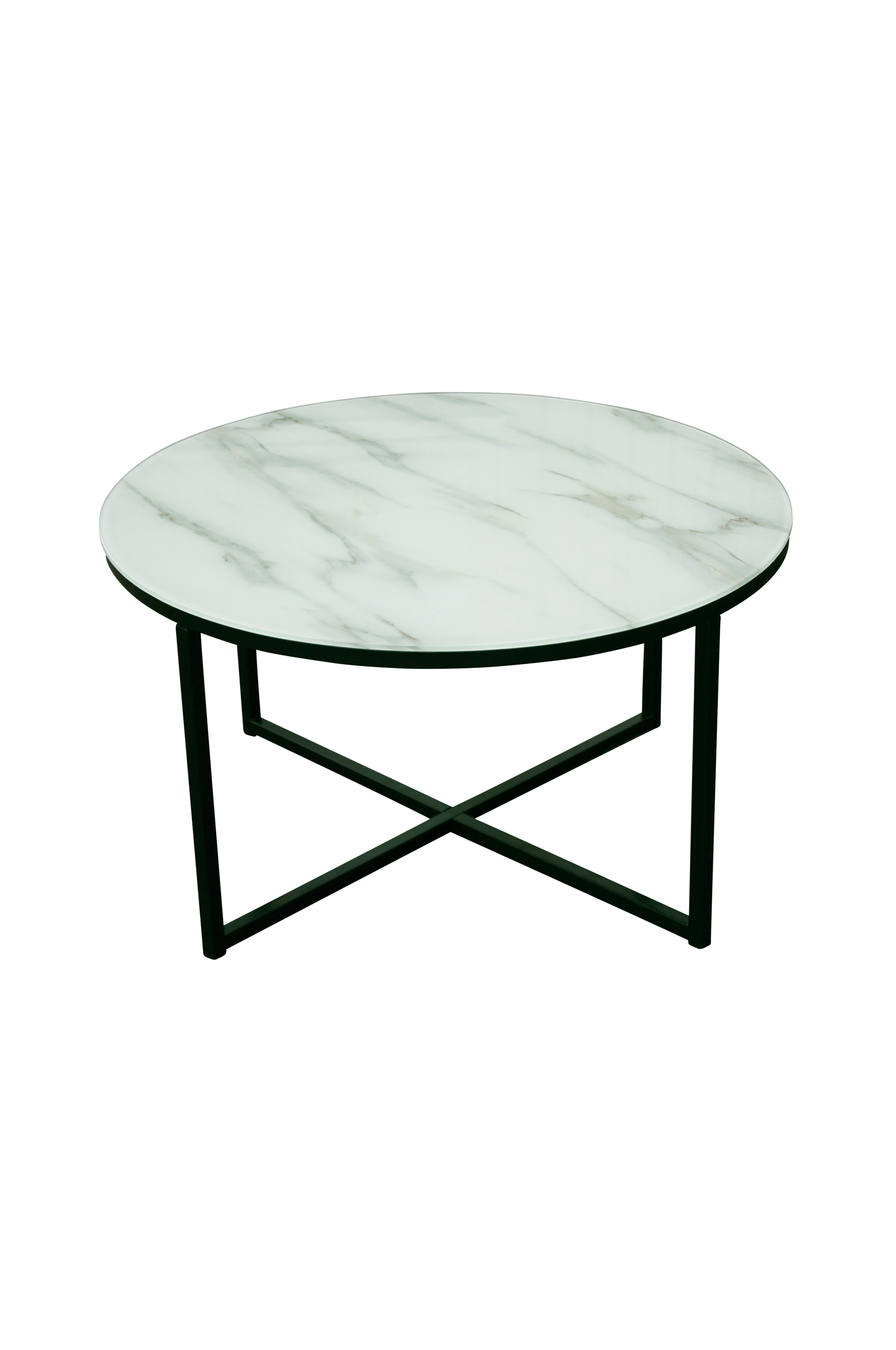 Moderne sofabord med plate av herdet glass med marmorfolie. Svarte metallben. Diameter: 80 cm. Høyde: 45 cm.