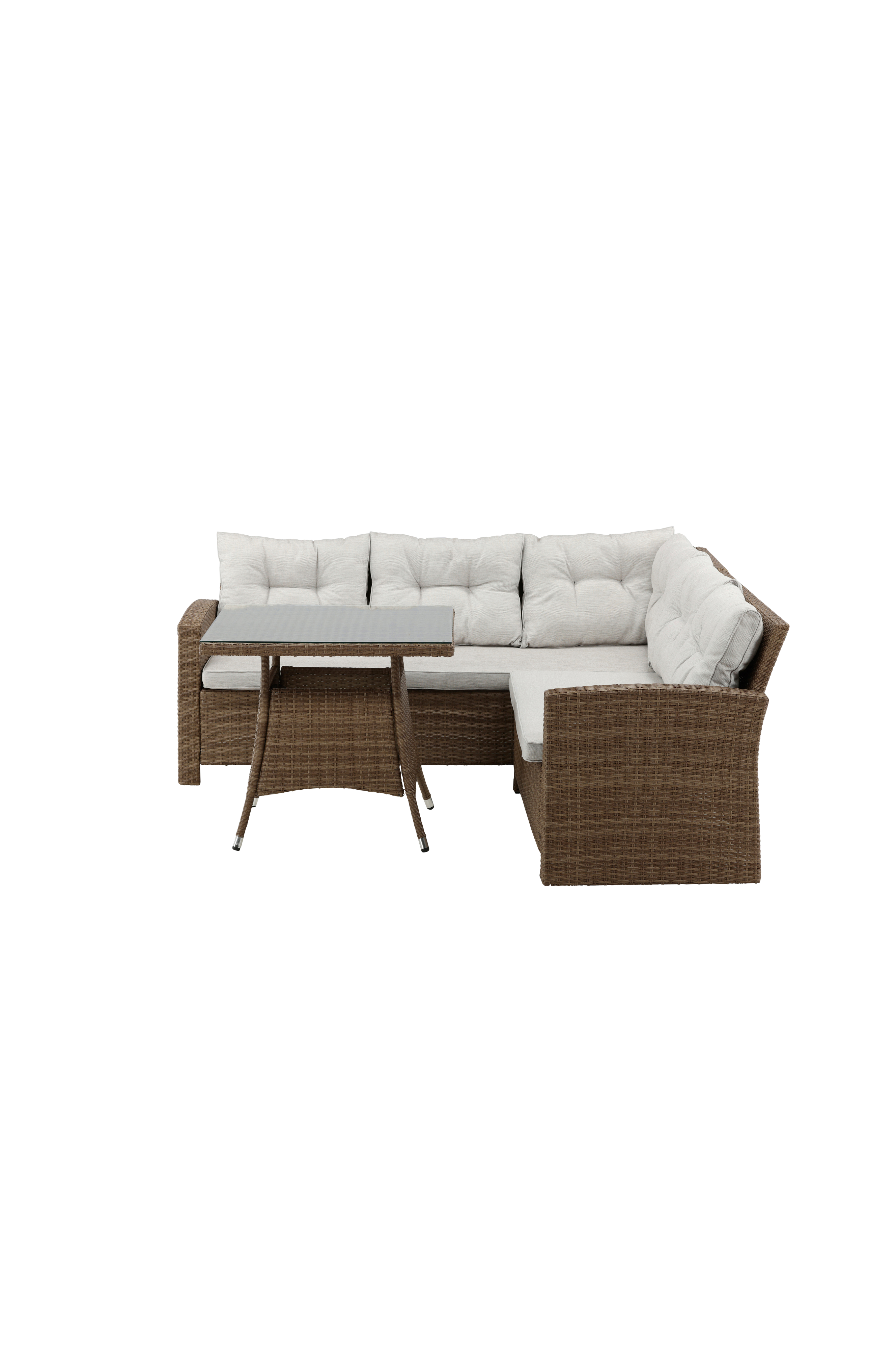Watford sofagruppe passer utmerket til din uteplass eller altan, og er skapt med fokus på komfort og tidløs design. Sofagruppen består av en hjørnesofa i farget kunstrotting med 5 sitteplasser og en hjørnedel, samt et høyt bord i kunstrotting med avlastningshylle og bordplate i glass. Sandfargede pikerte puter er inkludert i sofagruppen, og medvirker til et innbydende blikkfang!