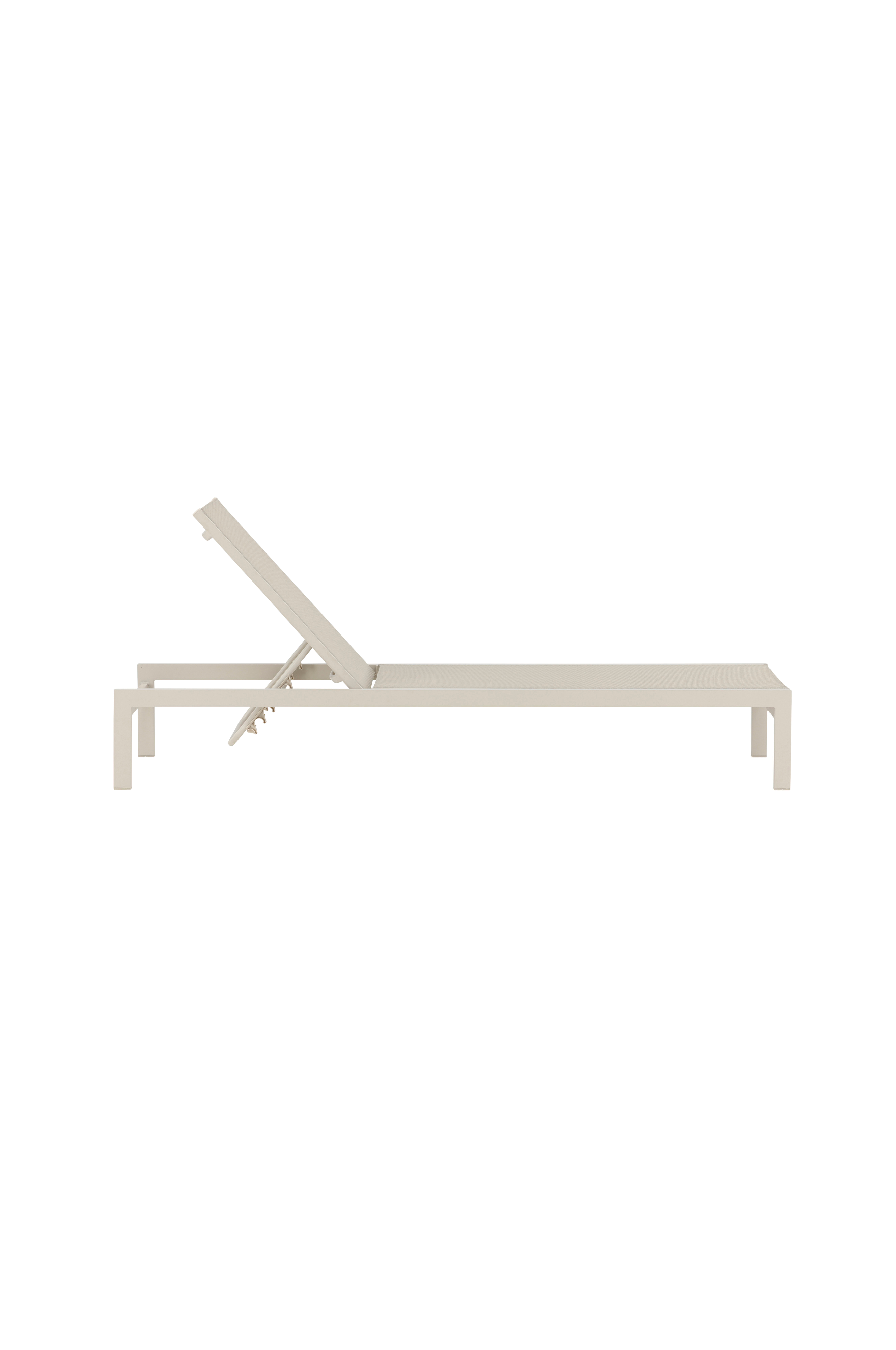 Klassisk solseng i beige aluminium og tekstil. Ryggstøtten på solsengen er justerbar - nyt en god lur eller sitt komfortabelt og les en god bok!